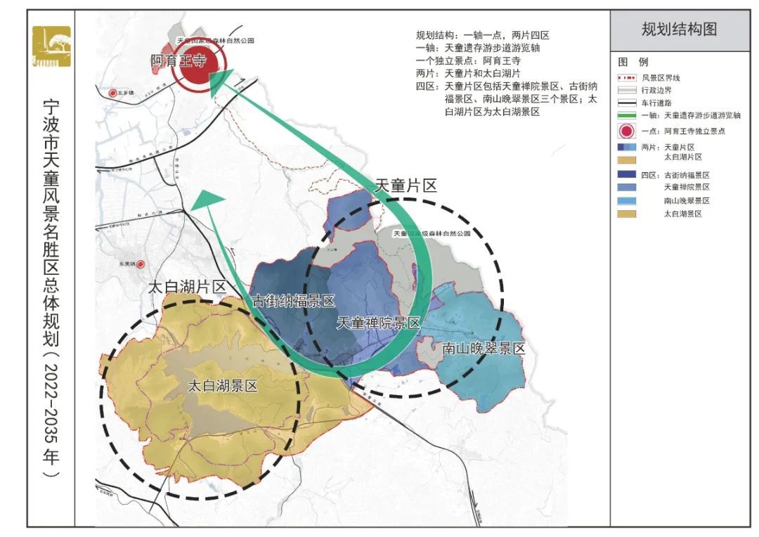 规划将天童风景名胜区划分为一轴一点两片四区:一轴为天童遗存游步道游览轴;一点为阿育王寺;两片为天童片和太白湖片,其中天童片区包括天童禅院景区、古街纳福景区、南山晚翠景区三个景区,太白湖片区为太白湖景区。
