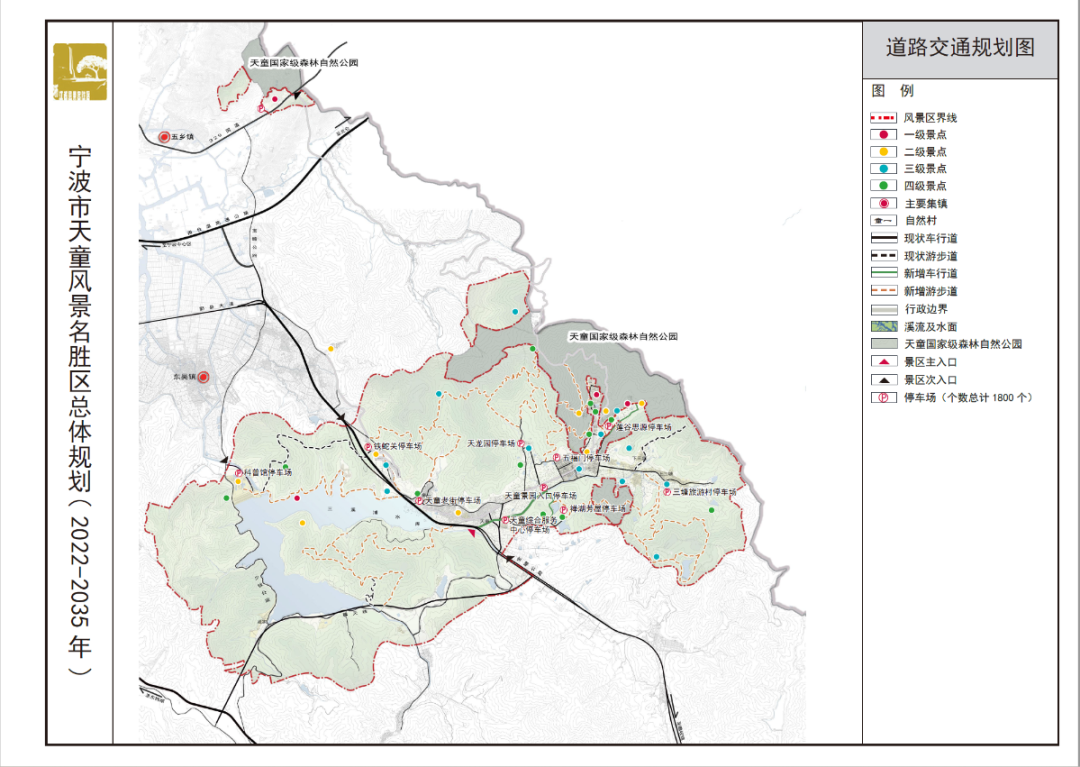 天童片区规划新建从宝瞻公路沿东涧溪南侧至彩虹桥道路,将景区出入口外迁至天童老街东端,东涧溪两侧地块。东涧溪南侧作停车场,东涧溪北侧作游客服务中心和景区公交换乘中心等。景区内电瓶车游览从换乘中心出发,沿三塘公路至五福门东侧道路,与现有电瓶车环线相接。太白湖片区的车行游览交通,主要利用景区内原有的少钱公路,对韩天线进行局部调整改建,使车行游览交通更加顺畅。