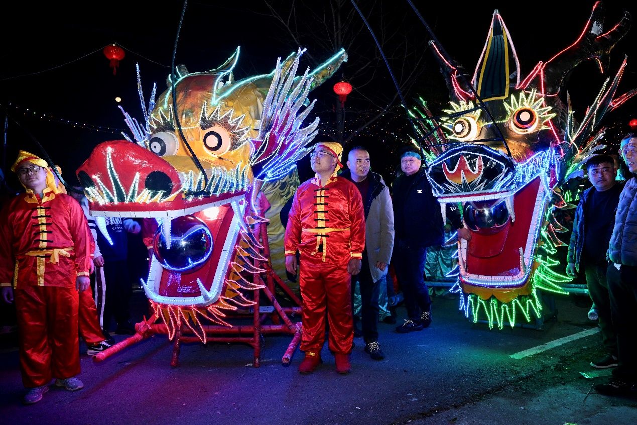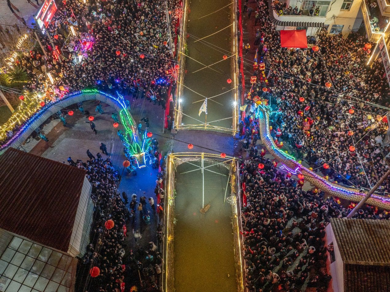 在人群的簇拥下,一条头高3.8米、身长32米的白龙和一条头高3.5米、身长39米的青龙由村里80多名壮汉抬着,在古桥上相会。随后,两条巨龙一南一北,雄纠纠气昂昂向村里蜿蜒游去,气势磅礴、威武无比。