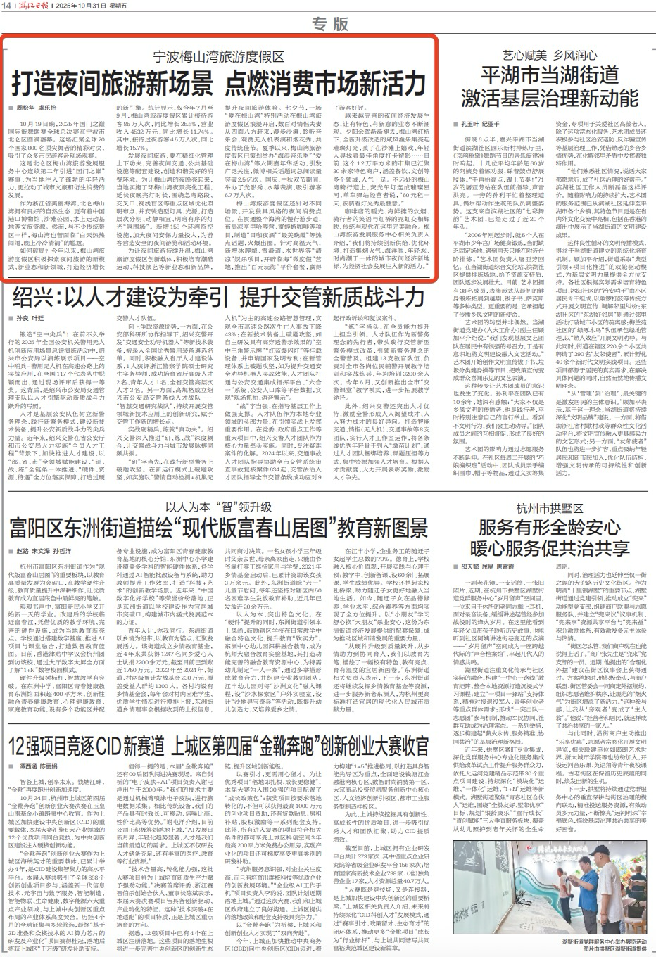 为让夜间旅游持续升温,梅山湾旅游度假区创新载体,积极培育潮酷运动、科技演艺等新业态和新品牌,提升夜间旅游体验。七夕节,一场“爱在梅山湾”特别活动在梅山湾旅游度假区浪漫开启,数百对情侣夫妻从四面八方赶来,漫步沙滩,聆听音乐会,观赏无人机表演和烟花秀,共度传统佳节。夏季以来,梅山湾旅游度假区已策划举办“海浪音乐季”“爱在梅山湾”等六期嘉年华活动,引发广泛关注,微博相关话题词总阅读量突破2.5亿次。国庆、中秋双节期间,举办了光影秀、水幕表演,吸引游客6.7万人次。