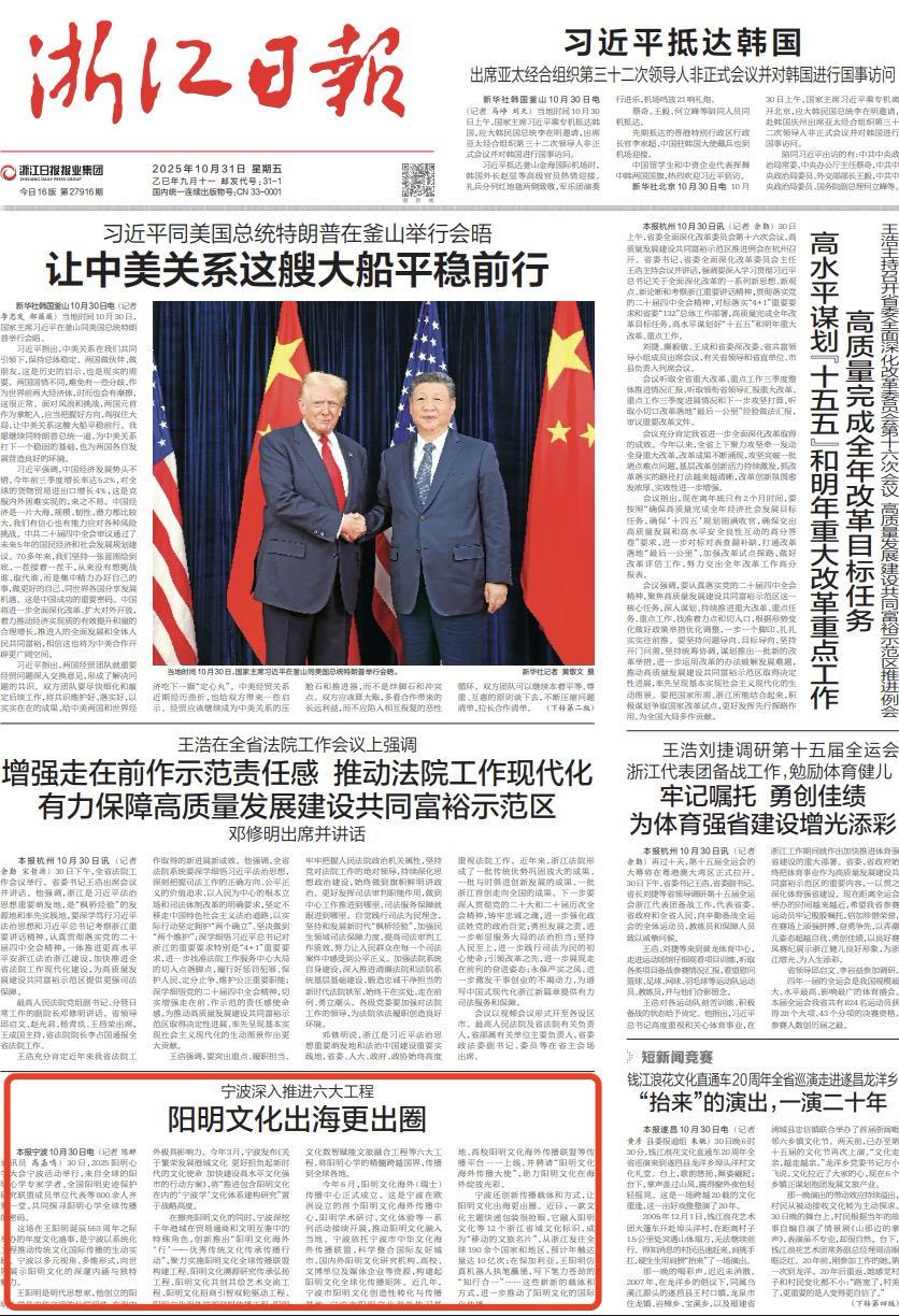 在擦亮阳明文化的同时,宁波深挖千年港城在贸易通商和文明互鉴中的特殊角色,创新推出“阳明文化海外‘行’——优秀传统文化传承传播行动”,聚力实施阳明文化全球传播联盟构建工程、阳明文化溯源研究传承弘扬工程、阳明文化共创共绘艺术交流工程、阳明文化招商引智双轮驱动工程、阳明文化海外拼图融媒传播工程、阳明文化数智赋能文旅融合工程等六大工程,将阳明心学的精髓跨越国界,传播到全球各地。