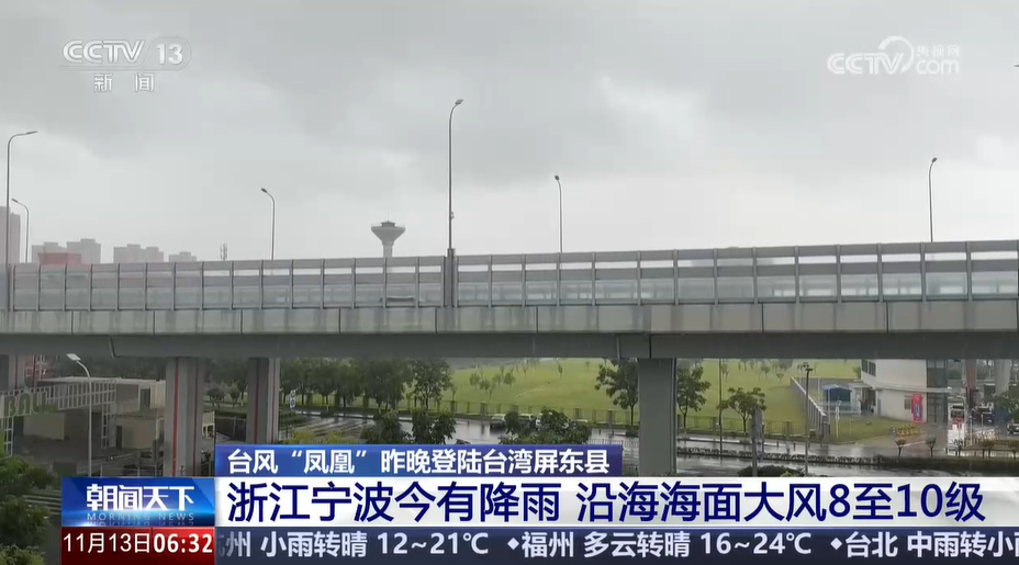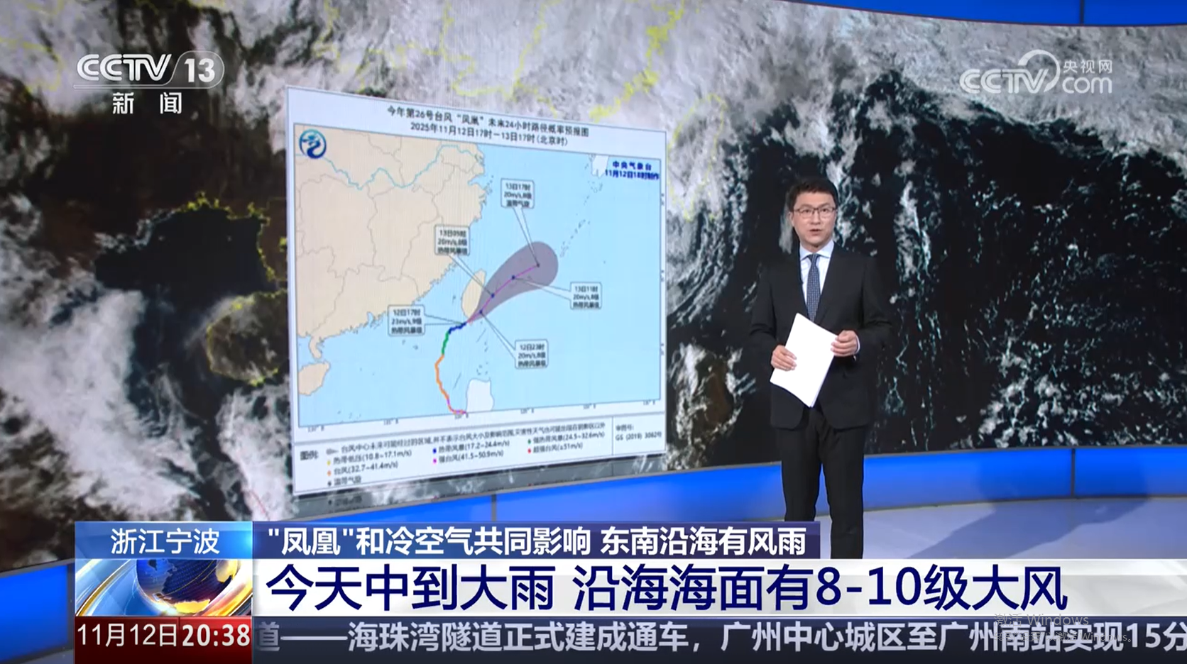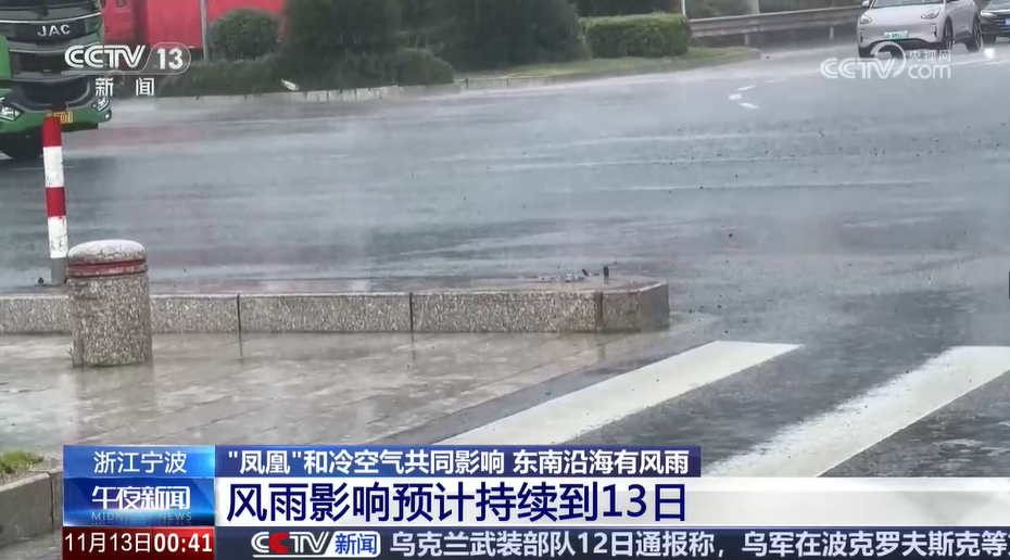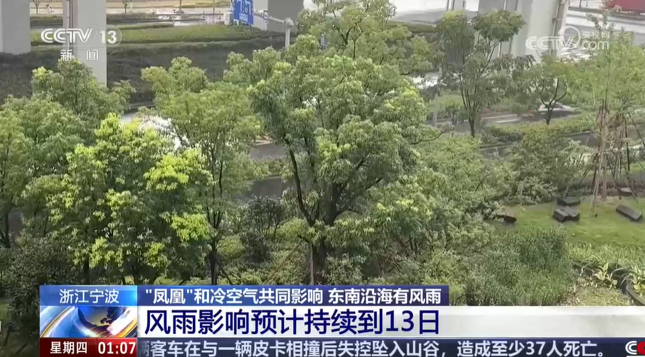 11月12日、13日,央视《共同关注》《东方时空》《午夜新闻》《新闻直播间》《朝闻天下》栏目播出《“凤凰”和冷空气共同影响 东南沿海有风雨·浙江宁波 今天中到大雨 沿海海面有8-10级大风》,报道了受台风“凤凰”外围环流和冷空气的共同影响,11日夜里开始,宁波遭遇明显降水过程,12日雨量达到中到大雨。此外,这两天宁波沿海海面会有8~10级大风,这场风雨影响预计会持续到11月13日。14日起,宁波天气将会明显转好,但是气温也会明显下降,预计14日到16日最低气温将会降到10℃—12℃。