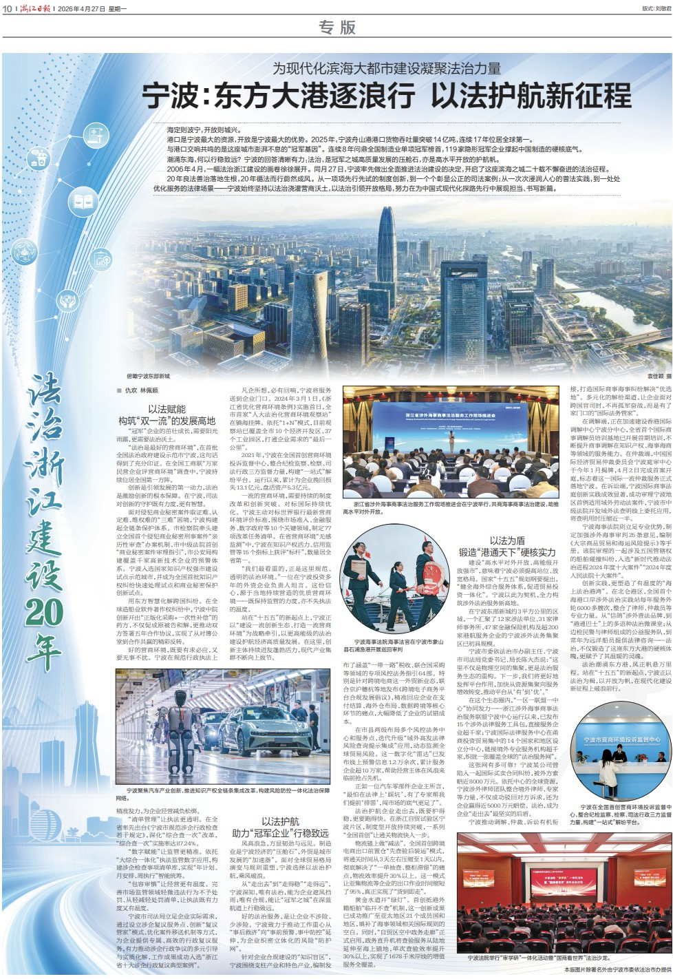 潮涌东海,何以行稳致远?宁波的回答清晰有力:法治,是冠军之城高质量发展的压舱石,亦是高水平开放的护航帆。