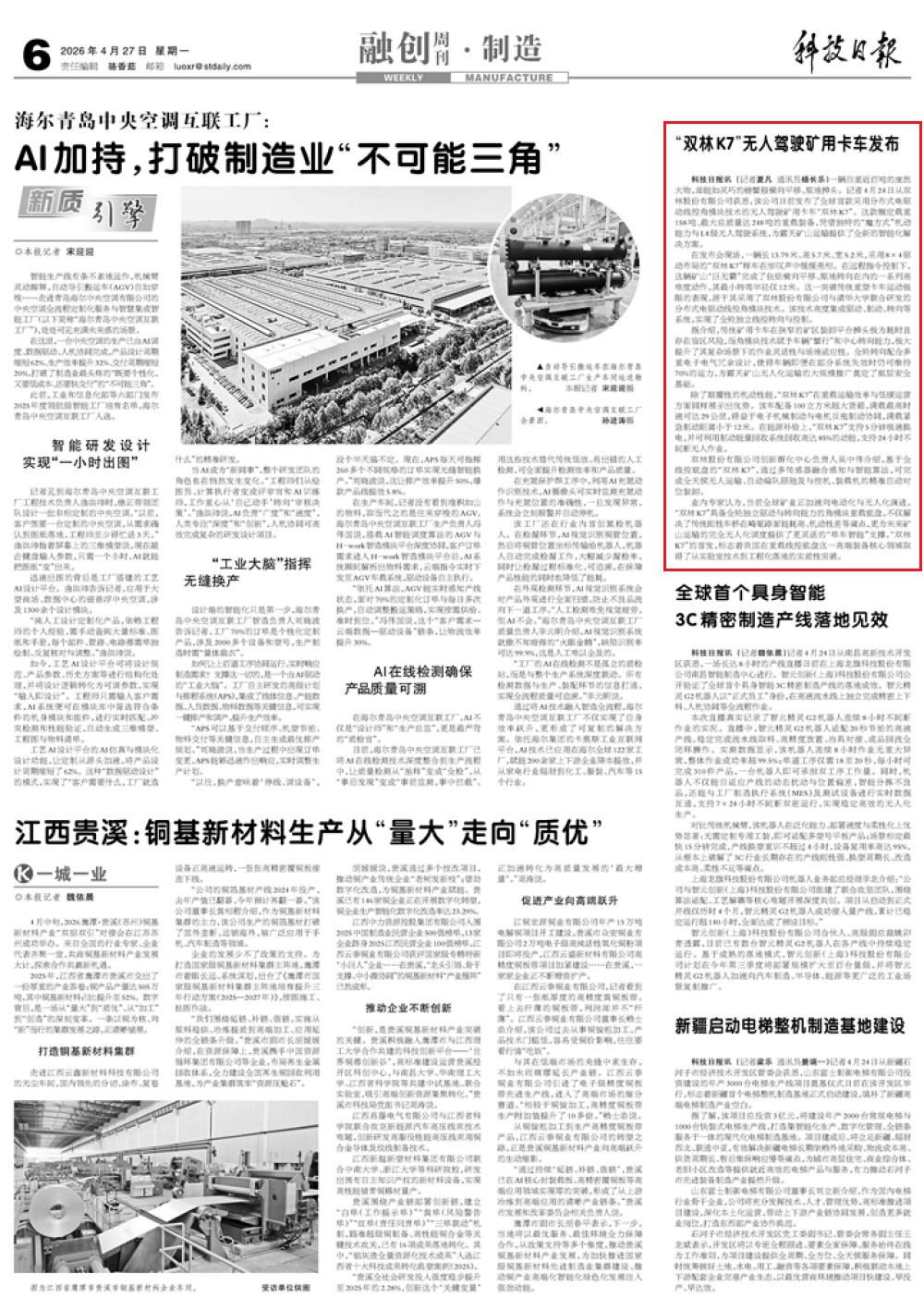 今天(4月27日),《科技日报》在第6版和第7版连续刊发两篇文章关注宁波。其中,第6版刊发《“双林K7”无人驾驶矿用卡车发布》,报道了双林股份有限公司日前发布了全球首款采用分布式电驱动线控角模块技术的无人驾驶矿用卡车“双林K7”。这款额定载重158吨、最大总质量达248吨的重载装备,凭借独特的“魔方式”机动能力与L4级无人驾驶系统,为露天矿山运输提供了全新的智能化解决方案。