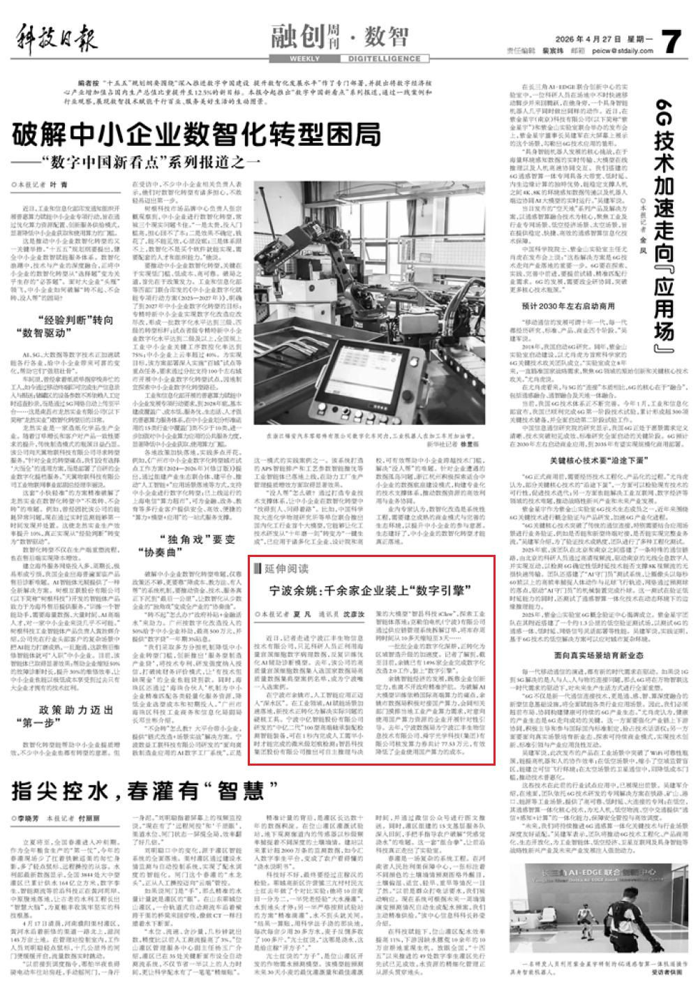 同日第7版刊发《宁波余姚:千余家企业装上“数字引擎”》,报道了截至目前,宁波余姚已有1496家企业完成数字化改造2.0工作,装上“数字引擎”。去年,宁波数据局为宁波江丰生物信息技术有限公司、舜宇光学科技(集团)有限公司核发算力券共计77.53万元,有效降低了企业使用国产算力的成本。