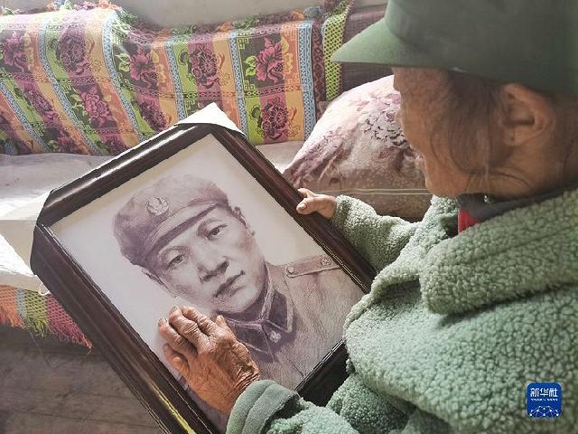 图为2021年11月28日,当独龙江边境派出所将画好的齐当此烈士照片送到遗孀齐秀珍手中时,老人抚摸着丈夫的遗像泪流满面。(独龙江边境派出所 供图)