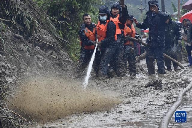 2020年5月下旬,独龙江边境派出所民警在泥石流灾害中开展抢险救援工作。(怒江边境管理支队 供图)