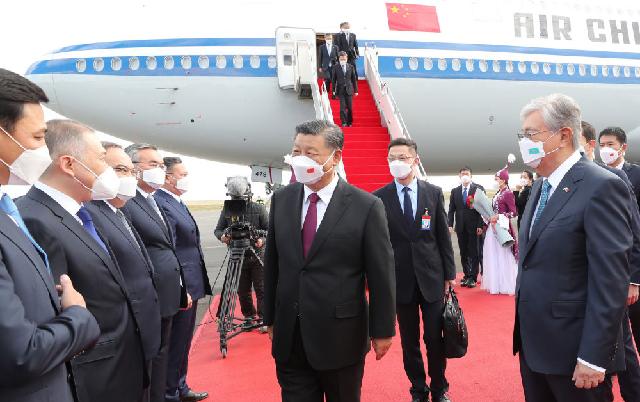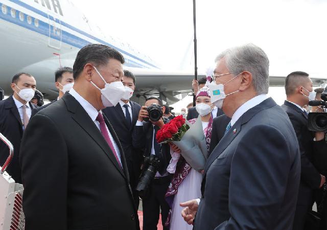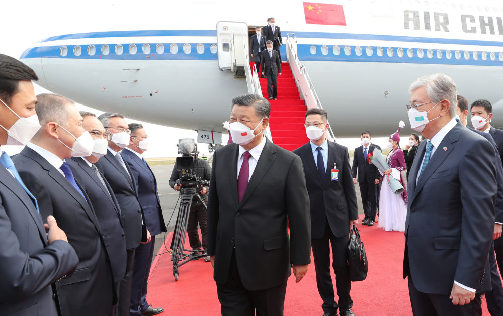 当地时间14日下午,习近平专机抵达努尔苏丹国际机场时,哈萨克斯坦总统托卡耶夫率政府副总理兼外长特列乌别尔季、努尔苏丹市市长库里吉诺夫等高级官员在机场热情迎接。