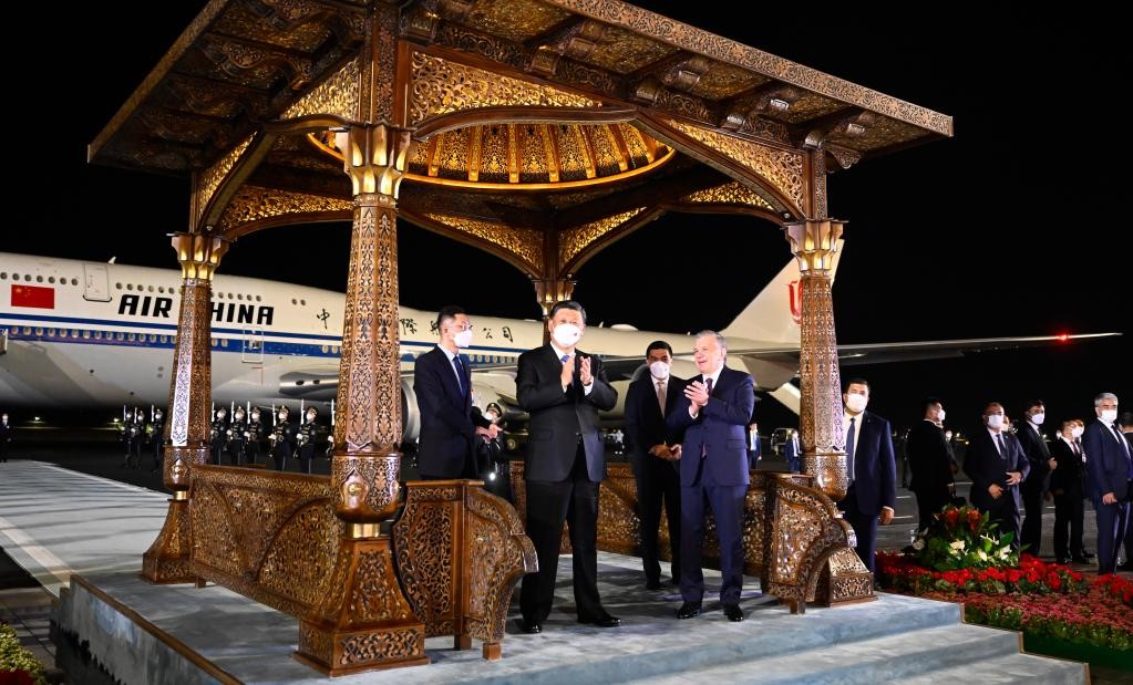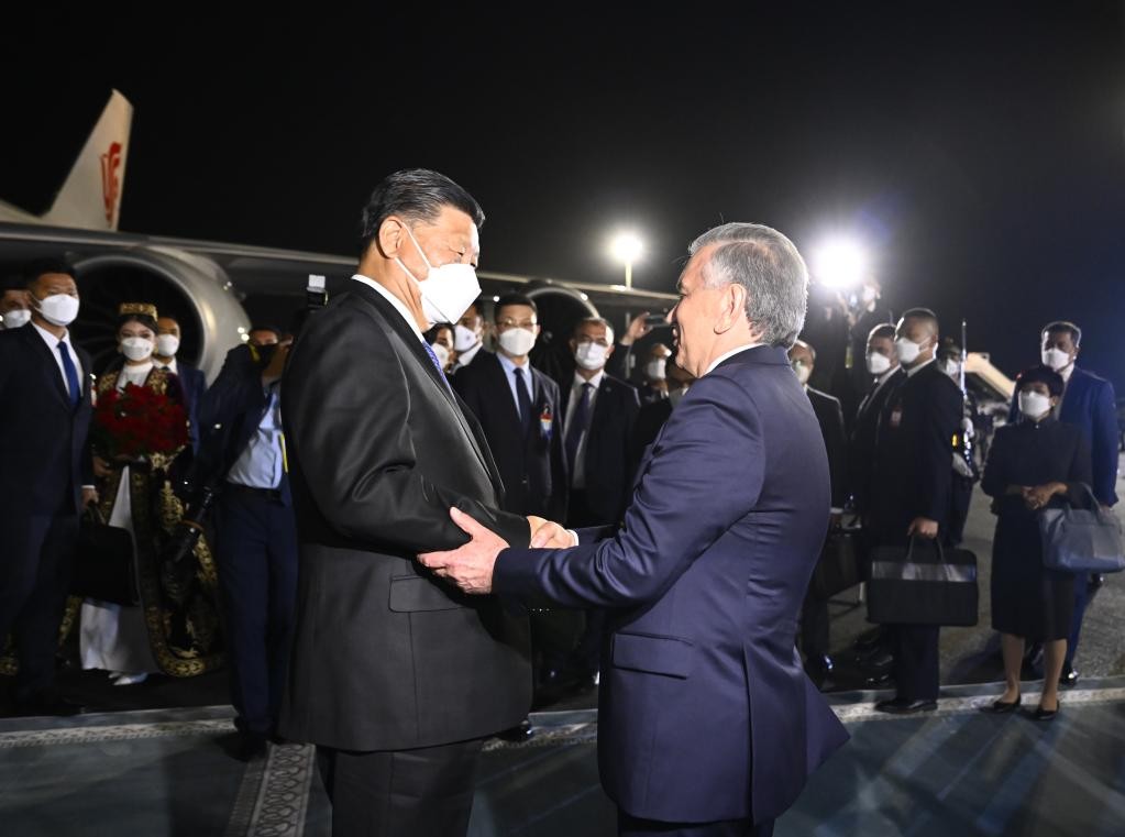 新华社乌兹别克斯坦撒马尔罕9月14日电 当地时间9月14日晚,国家主席习近平乘专机抵达撒马尔罕,开始对乌兹别克斯坦共和国进行国事访问并出席上海合作组织成员国元首理事会第二十二次会议。