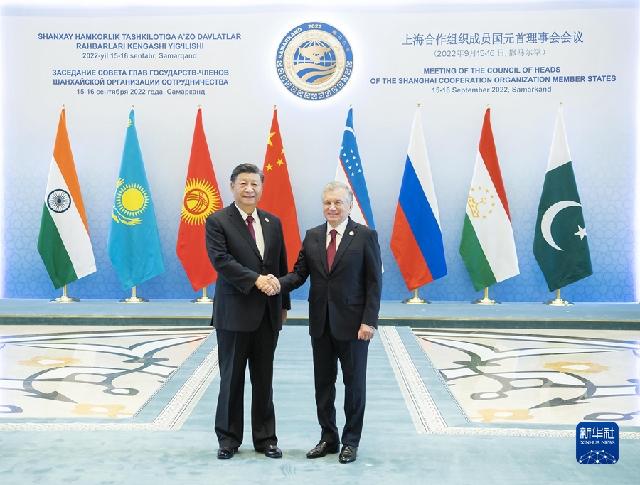 习近平强调,中国共产党即将召开第二十次全国代表大会,全面擘画下一个阶段中国发展蓝图。无论国际形势如何变化,中方将始终坚持和平发展、开放发展、合作发展、共同发展,视上海合作组织为外交优先方向,愿以自身发展助力地区国家发展,为各国人民创造更多福祉。