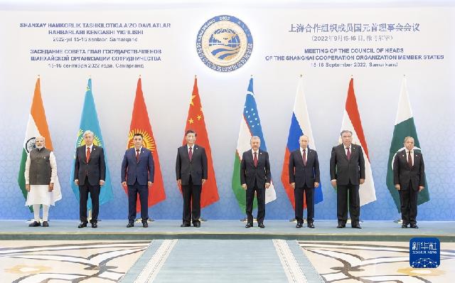 当地时间9月16日,国家主席习近平在撒马尔罕国际会议中心出席上海合作组织成员国元首理事会第二十二次会议小范围会谈。这是小范围会谈前,上海合作组织成员国领导人集体合影。新华社记者 李涛 摄