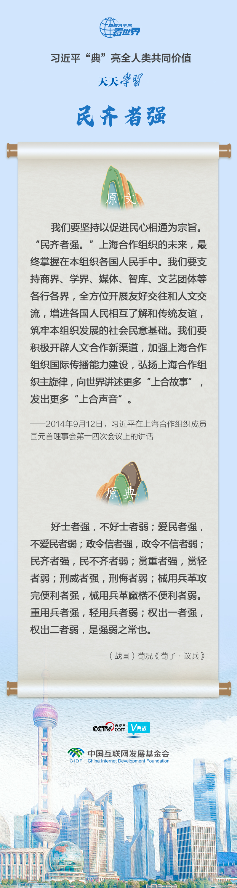 2014年,在上海合作组织成员国元首理事会第十四次会议上,习近平主席引用古语“民齐者强”深刻指出,我们要坚持以促进民心相通为宗旨,上海合作组织的未来,最终掌握在本组织各国人民手中。
