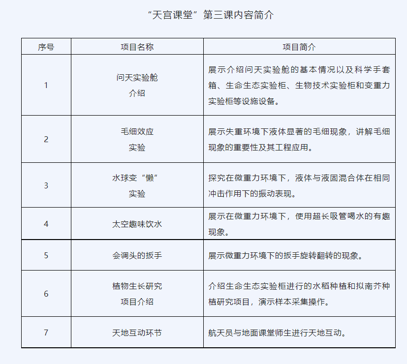 本次太空授课活动将继续采取天地互动方式进行,3名航天员将在轨介绍展示中国空间站问天实验舱工作生活场景,演示微重力环境下毛细效应实验、水球变“懒”实验、太空趣味饮水、会调头的扳手以及植物生长研究项目介绍,并与地面课堂进行互动交流(授课内容介绍附后),旨在传播普及载人航天知识,激发广大青少年对科学的兴趣。