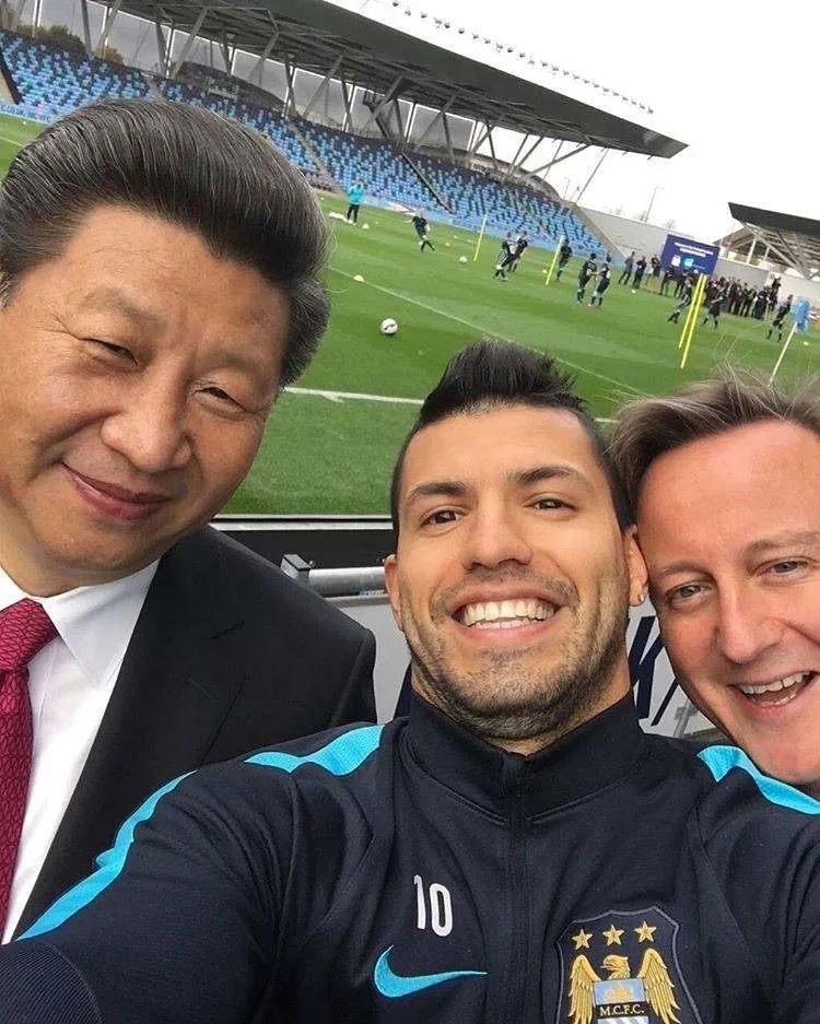2015年10月,球星阿奎罗与习近平主席和时任英国首相卡梅伦的合照。(图源/人民日报客户端)