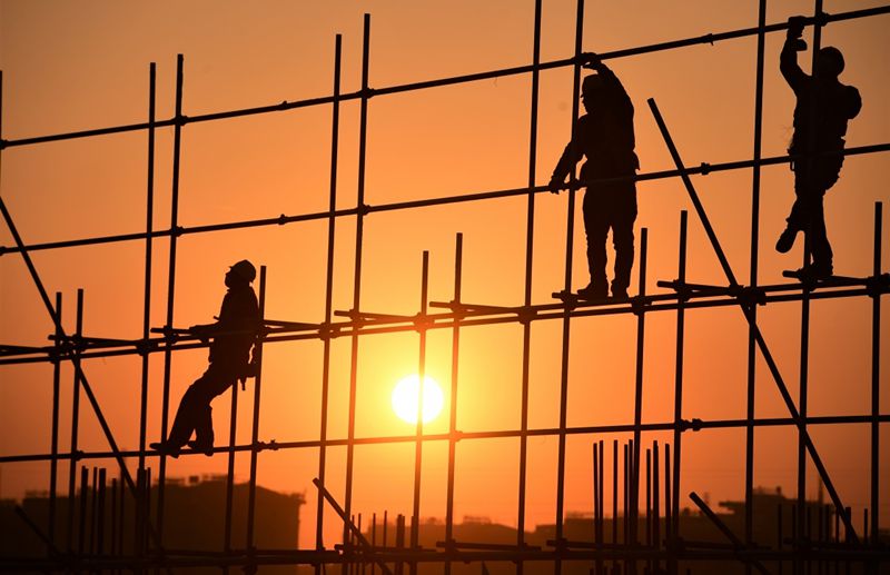 2022年1月1日,在河北雄安新区容西安置房项目D标段施工现场,工人在新年第一缕阳光的照耀下工作。
