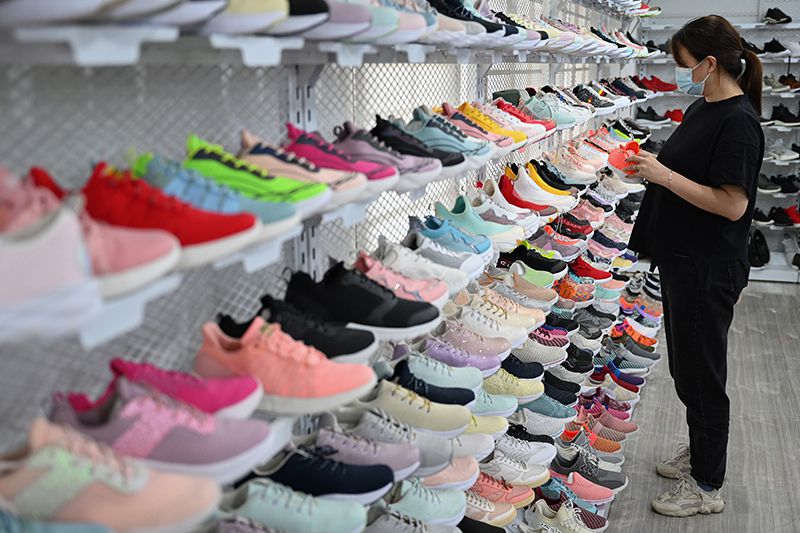 2022年5月16日,在福建省晋江国际鞋纺城,一家鞋材企业的销售人员在整理货架。
