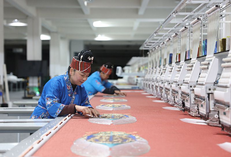 2023年2月13日,贵州省黔东南苗族侗族自治州施秉县工业园区,工人在机绣车间作业。