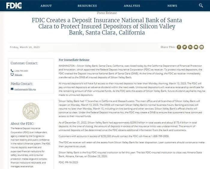 美国联邦存款保险公司(FDIC)发布公告称,美国硅谷银行10日被美国加利福尼亚州金融保护和创新部关闭,并指定美国联邦存款保险公司为接管方。