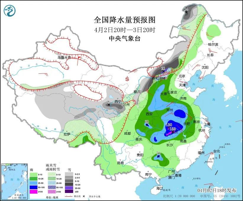 1、4月2日20时至3日20时,内蒙古中东部、新疆南疆盆地、西藏东部和北部、西北地区中部等地部分地区有小到中雪或雨夹雪,其中,内蒙古中部和东北部、黑龙江西北部、青海东部等地部分地区有大到暴雪,局地大暴雪。西北地区东部、华北西部、黄淮西部、江淮大部、江汉、江南北部、西南地区东北部等地部分地区有中到大雨,其中,河南东部和南部、安徽西部、湖北中东部、湖南北部等地部分地区有暴雨或大暴雨。
