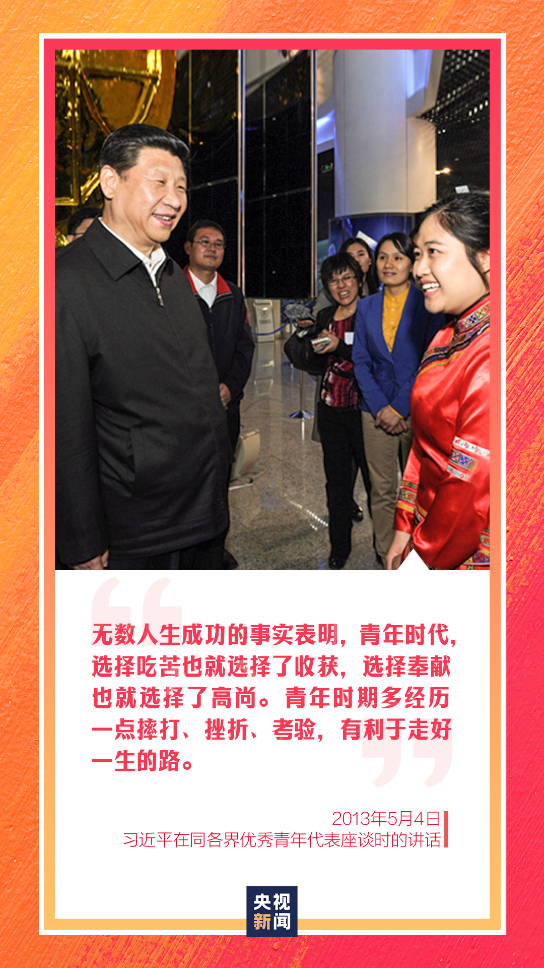 2013年5月4日,习近平总书记在同各界优秀青年代表座谈时曾说:“无数人生成功的事实表明,青年时代,选择吃苦也就选择了收获,选择奉献也就选择了高尚。青年时期多经历一点摔打、挫折、考验,有利于走好一生的路。”