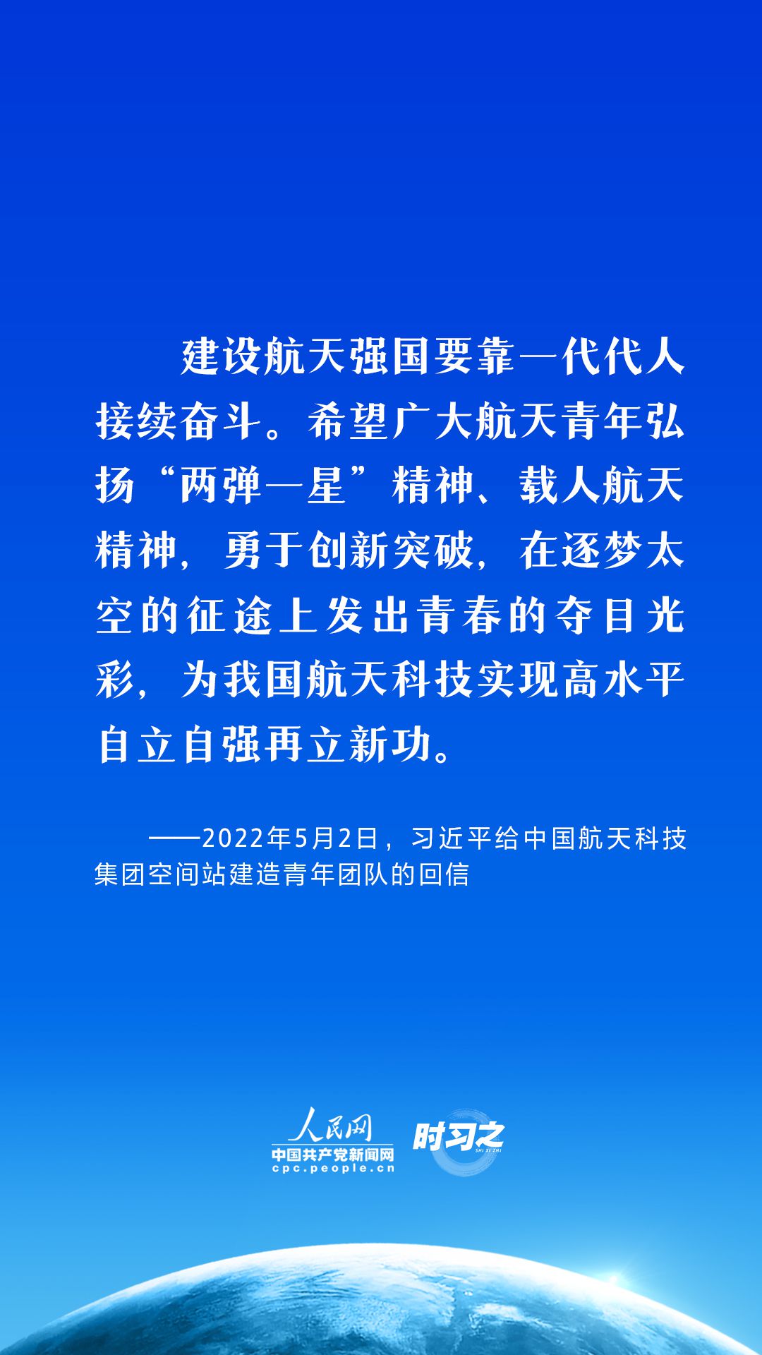 航天梦是强国梦的重要组成部分。党的十八大以来,习近平总书记高度重视我国航天事业发展,在不同场合,频频提及航天精神,并不断注入新的时代内涵,激励中国航天以勃发之气,巡天探宇叩问苍穹,向着建设航天强国的目标勇毅前行。