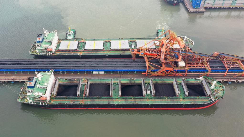 5月11日,船舶停靠在黄骅港煤炭港区码头(无人机照片)。新华社记者 骆学峰 摄