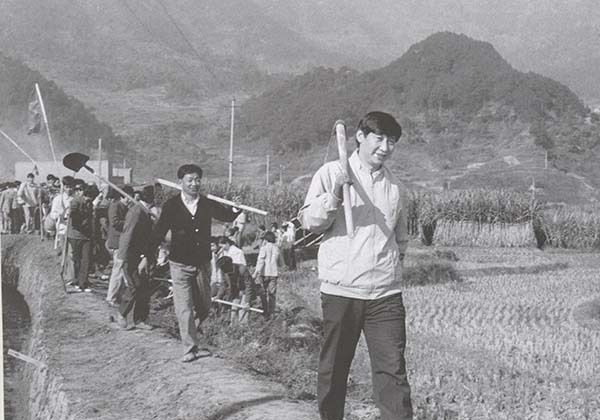 在福建宁德,习近平带领地直机关干部参加义务劳动,一把锄头扛肩上,大步走在田埂上。