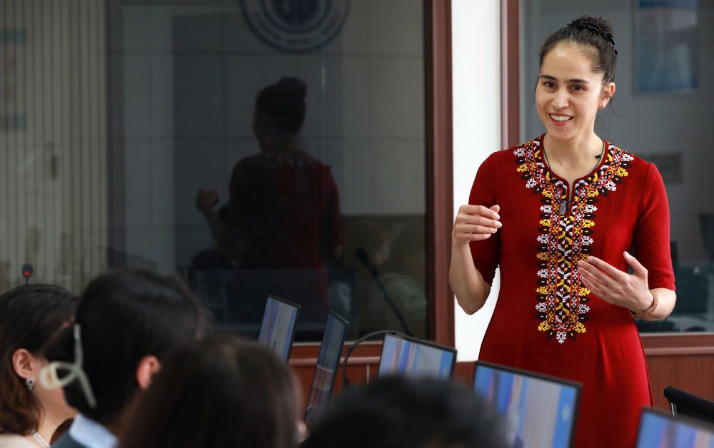 土库曼斯坦外教加汉在兰州交通大学国际教育学院国际中文实践基地给留学生上课(2023年5月5日摄)。在中国学习工作长达十多年,如今加汉能说一口流利的汉语。