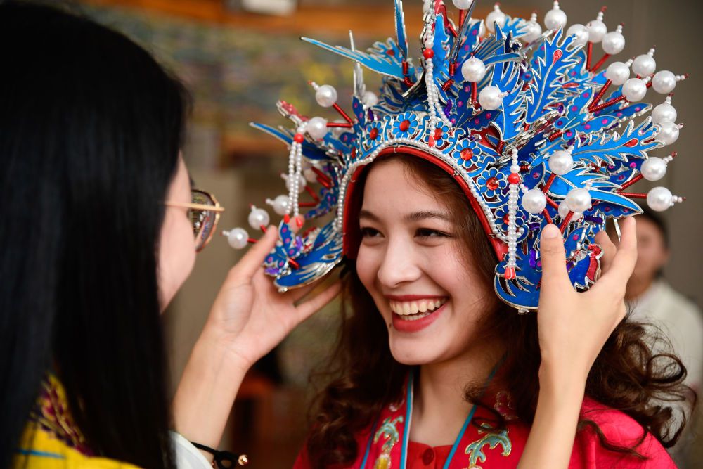 在青岛的中国石油大学(华东)大学生活动中心,哈萨克斯坦留学生珍珠体验京剧文化(2018年5月3日摄)