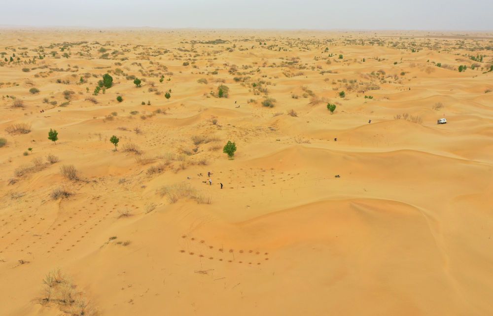 治沙客在内蒙古库布其沙漠亿利生态治理区种植苗木(2023年4月27日摄,无人机照片)。新华社记者 刘磊 摄