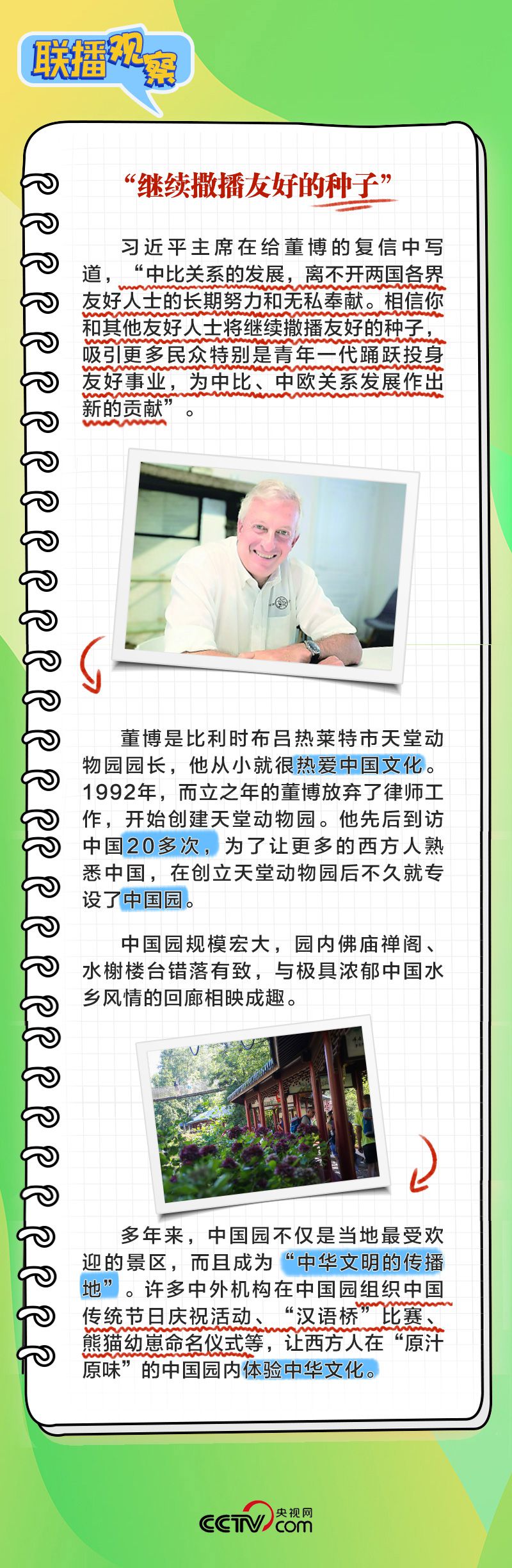 董博是比利时布吕热莱特市天堂动物园园长,他在给习主席致信中回顾了习主席和夫人彭丽媛2014年3月访比期间出席天堂动物园大熊猫园开园仪式的情景,表示中国园体现人与自然和谐共生理念,中国梦和中国的发展繁荣永远是可共享的机遇。