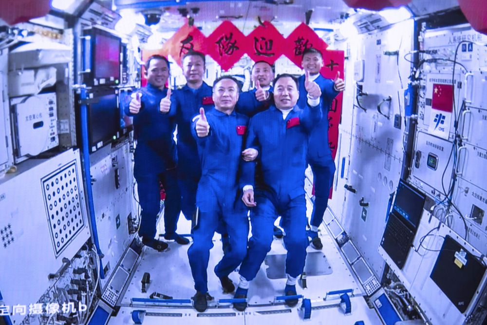 2023年5月30日在北京航天飞行控制中心拍摄的神舟十五号航天员乘组与神舟十六号航天员乘组拍下“全家福”的画面。新华社发(韩启扬摄)