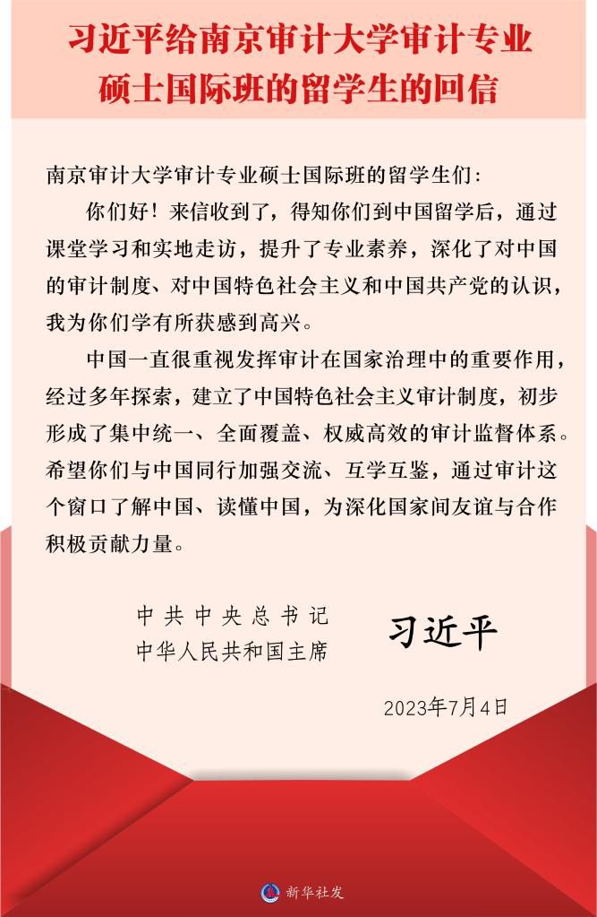 7月4日,习近平主席给南京审计大学审计专业硕士国际班的留学生回信,鼓励他们为深化国家间友谊与合作积极贡献力量。