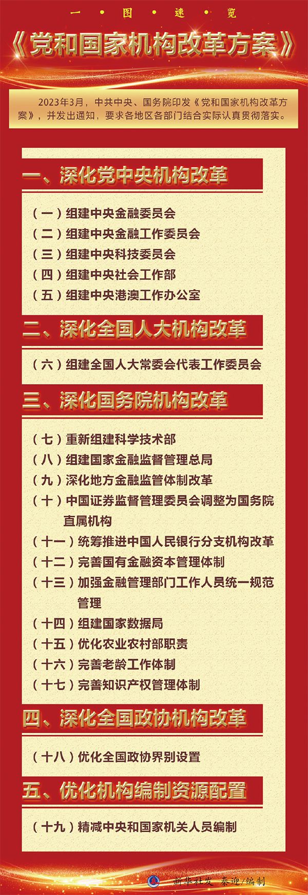 2023年3月10日上午9时许,北京人民大会堂大礼堂。2900多名全国人大代表按下表决器,十四届全国人大一次会议表决通过了关于国务院机构改革方案的决定,批准了根据《党和国家机构改革方案》形成的国务院机构改革方案。6天后,《党和国家机构改革方案》全文公开发布,向着强国建设、民族复兴的宏伟目标,党和国家机构改革扬帆破浪启新程。