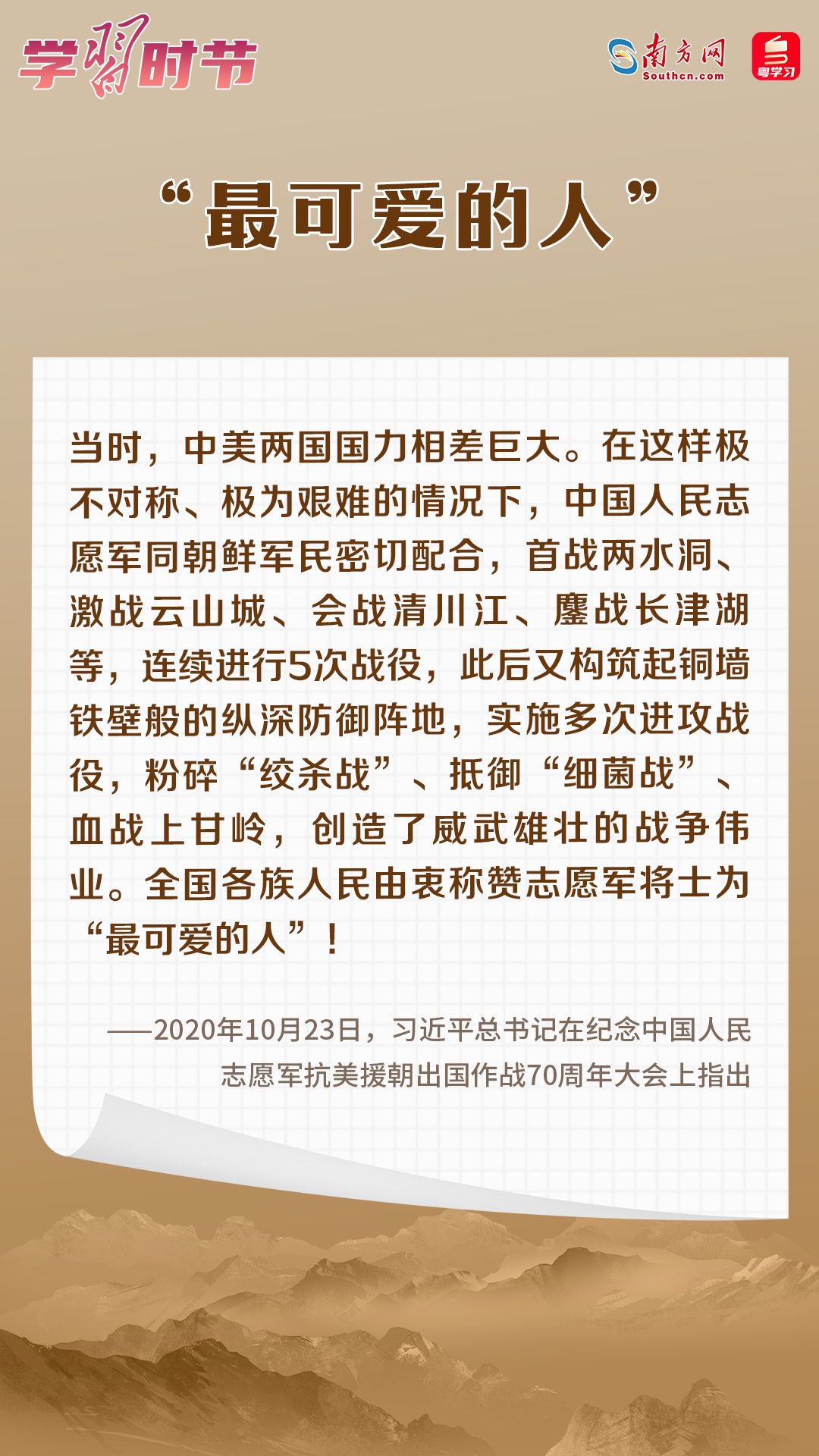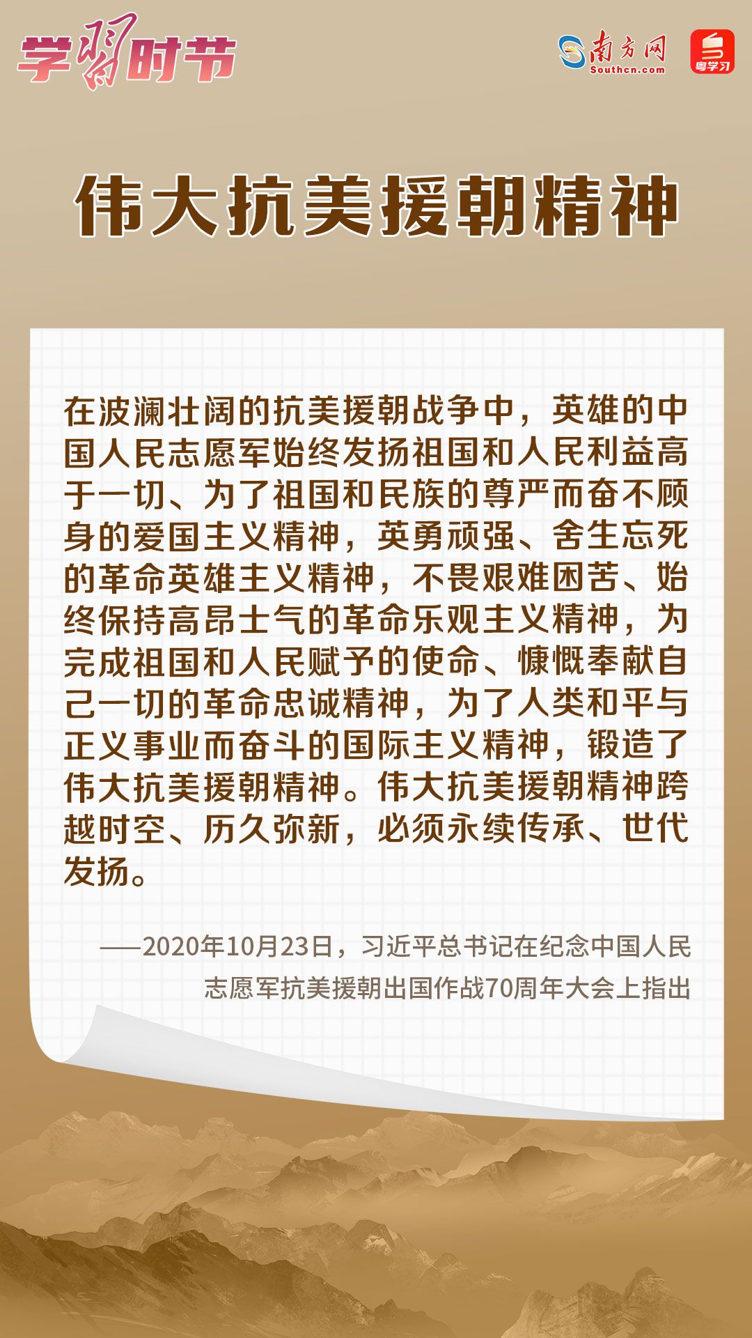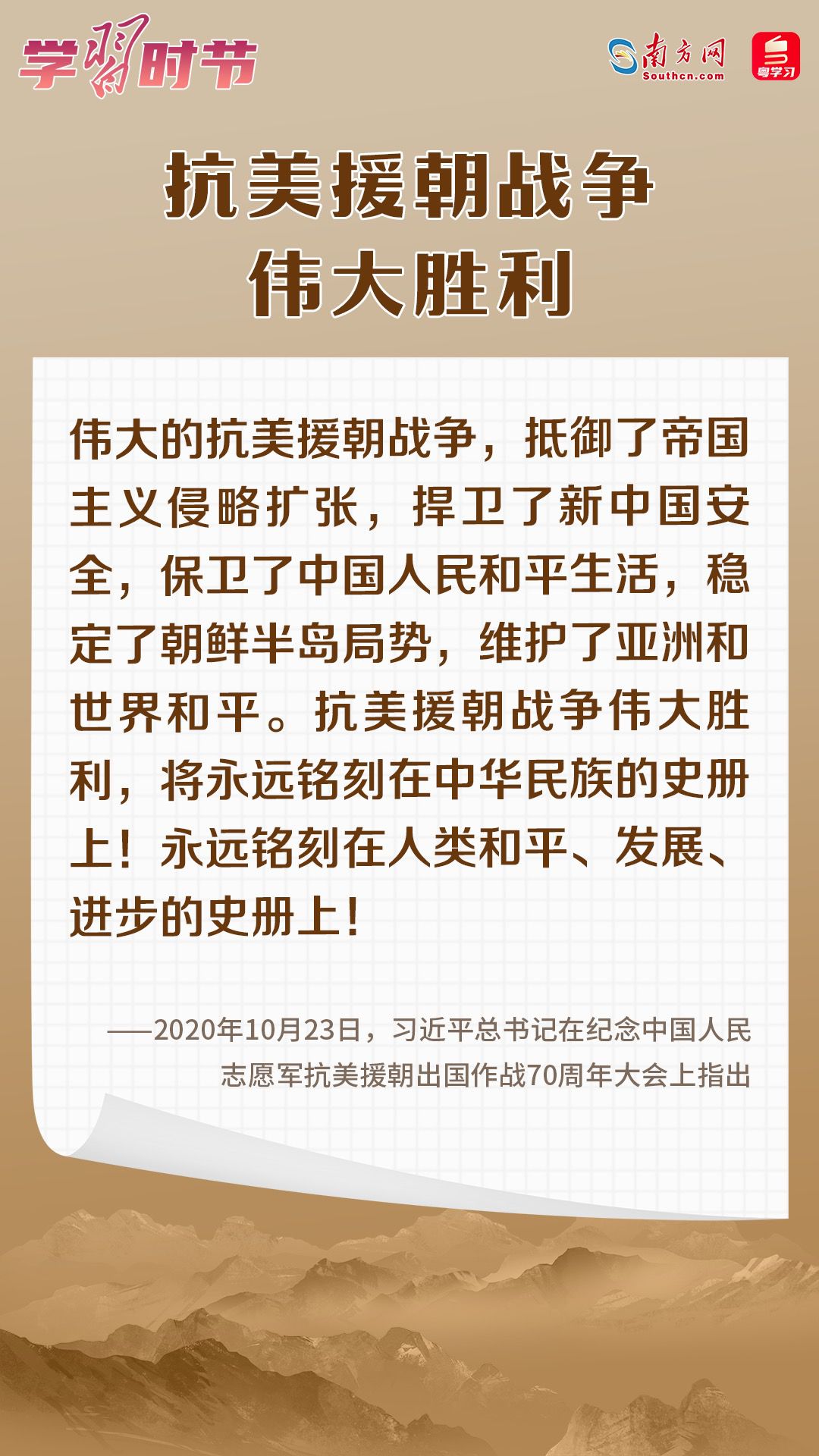 党的十八大以来,习近平总书记在多个场合深刻阐述抗美援朝战争的重大意义和时代价值。在波澜壮阔的抗美援朝战争中,英雄的中国人民志愿军锻造了伟大抗美援朝精神。在抗美援朝战争胜利70周年之际,让我们一起学习习近平总书记的重要论述,永续传承伟大抗美援朝精神。