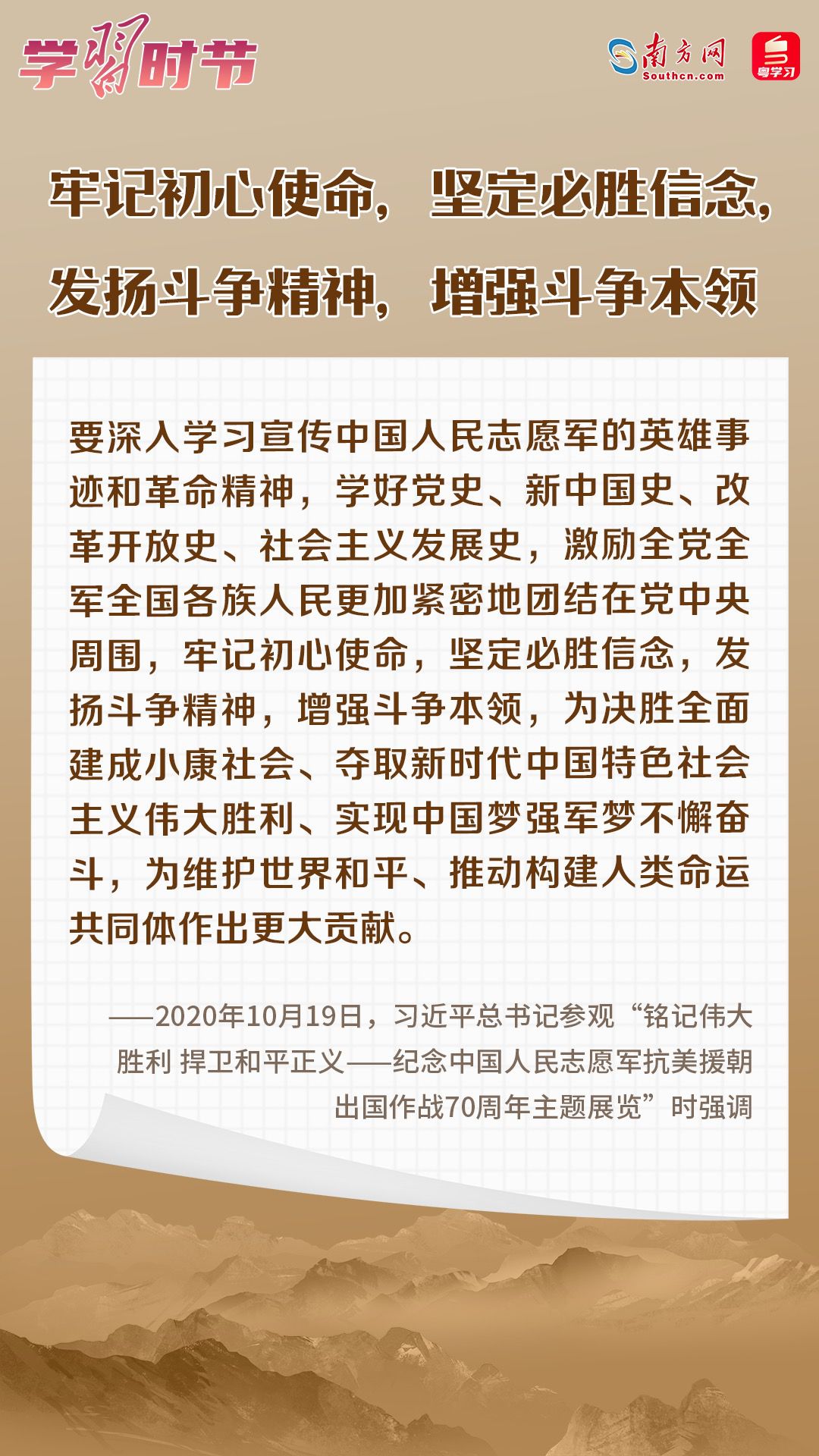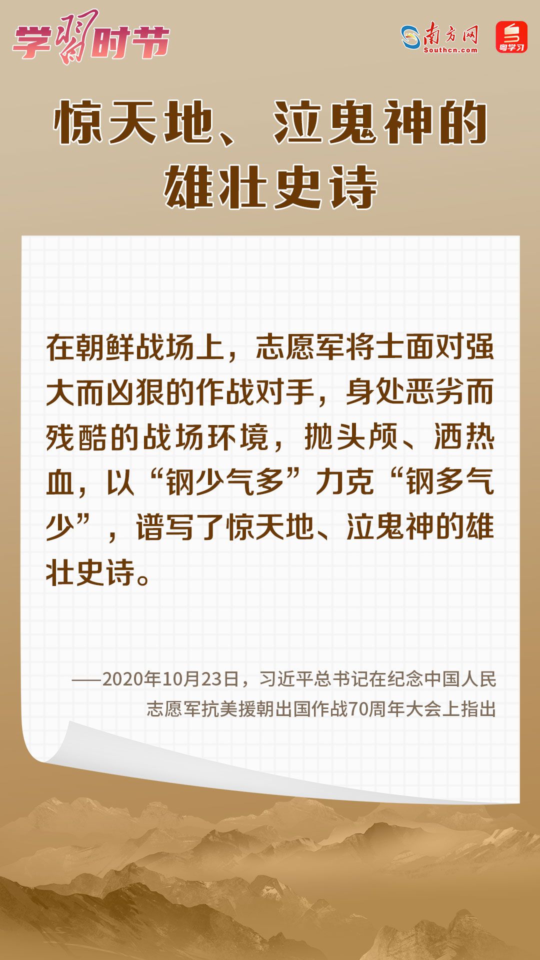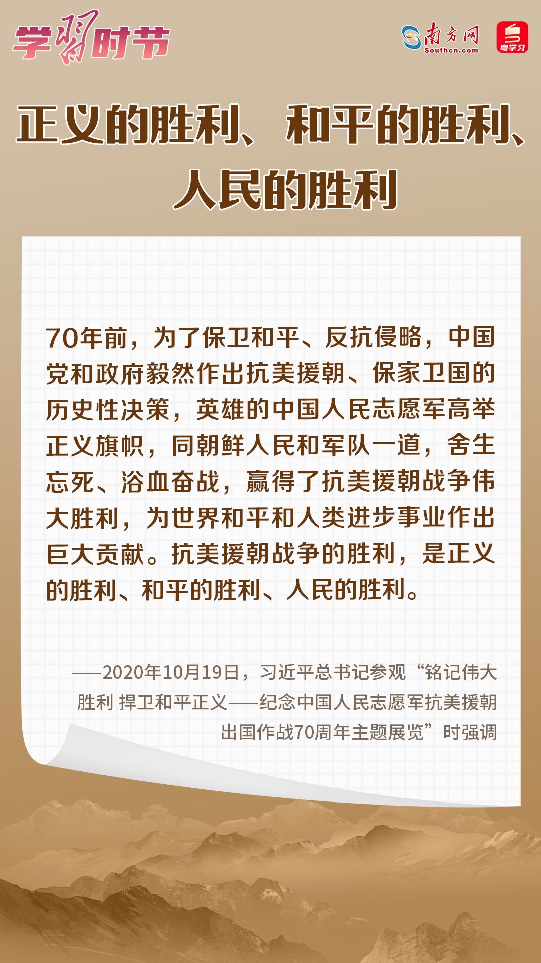 党的十八大以来,习近平总书记在多个场合深刻阐述抗美援朝战争的重大意义和时代价值。在波澜壮阔的抗美援朝战争中,英雄的中国人民志愿军锻造了伟大抗美援朝精神。在抗美援朝战争胜利70周年之际,让我们一起学习习近平总书记的重要论述,永续传承伟大抗美援朝精神。