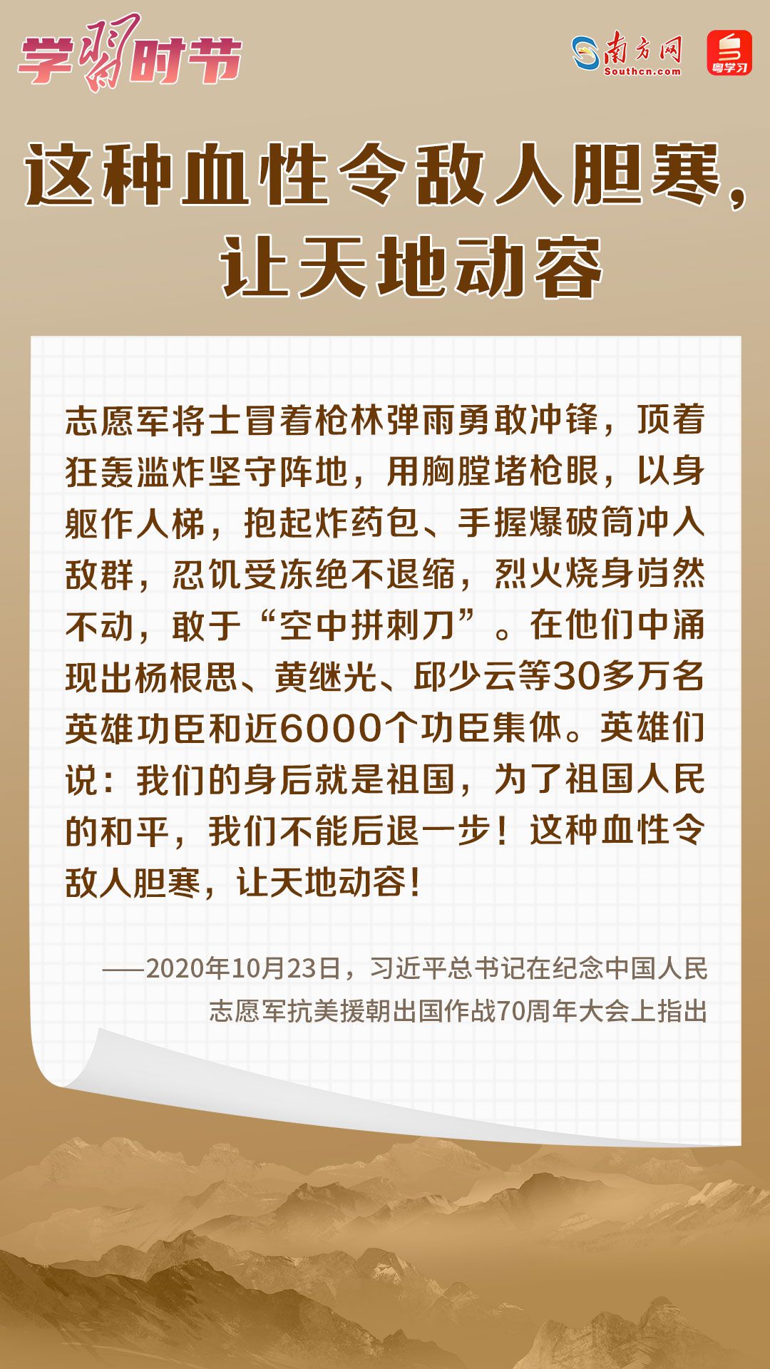 “天地英雄气,千秋尚凛然。”70多年前,由中华优秀儿女组成的中国人民志愿军,肩负着人民的重托、民族的期望,高举保卫和平、反抗侵略的正义旗帜,雄赳赳、气昂昂,跨过鸭绿江,发扬伟大的爱国主义精神和革命英雄主义精神,同朝鲜人民和军队一道,历经两年零9个月艰苦卓绝的浴血奋战,赢得了抗美援朝战争伟大胜利。