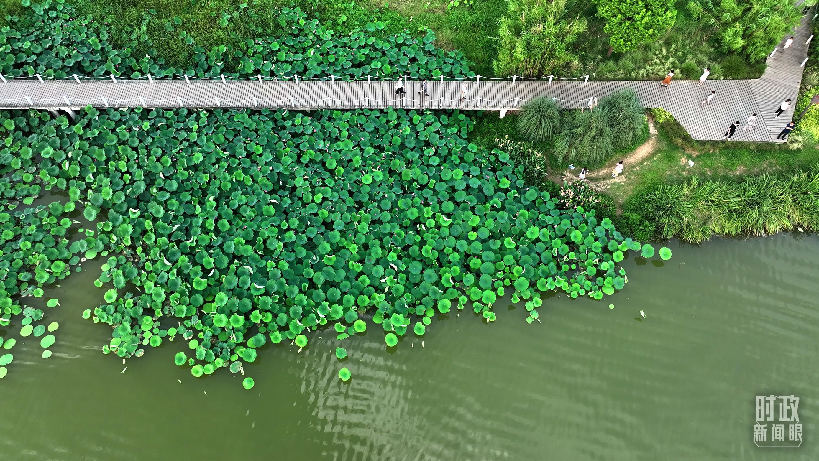 △天汉湿地公园内,游人穿行,荷影婆娑。(总台记者刘海涛拍摄)