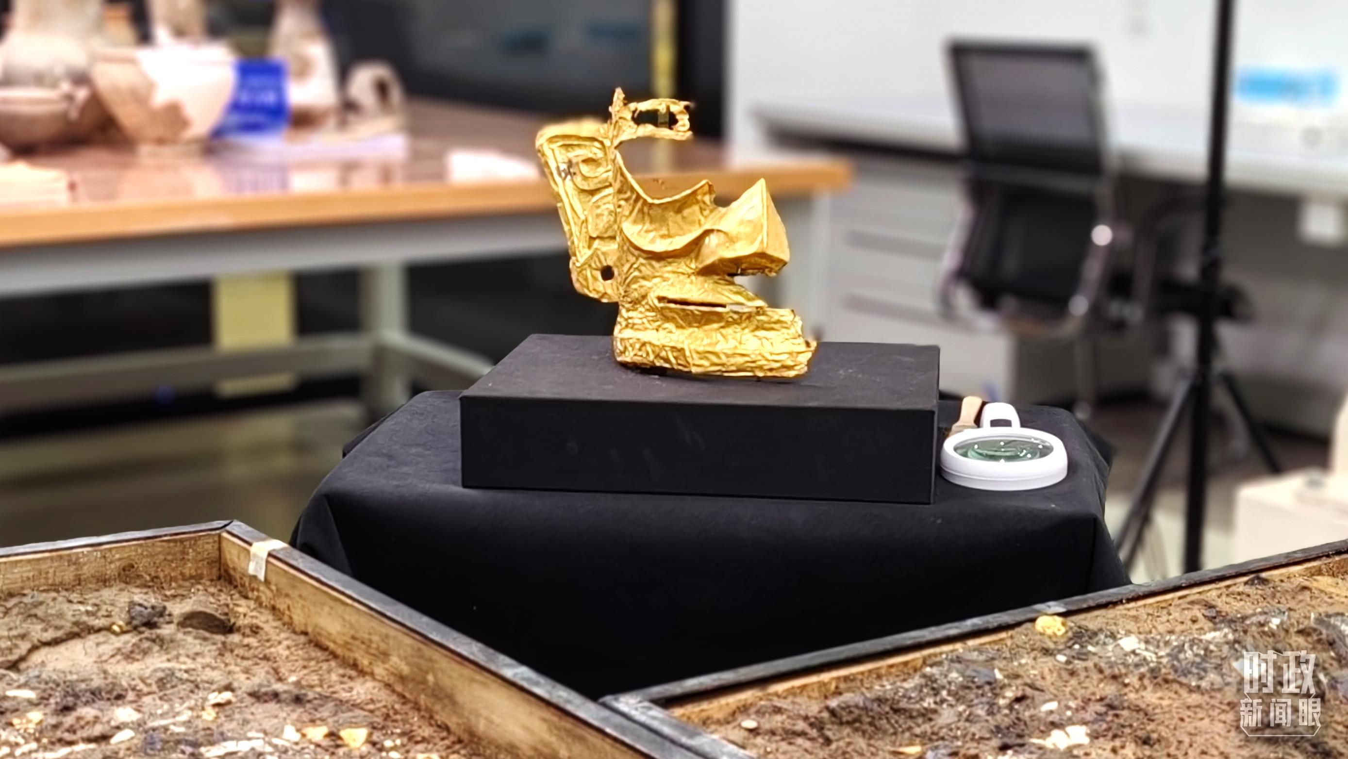 △文物保护修复展示中心内正在修复的金面具。(总台央视记者王萌萌拍摄)