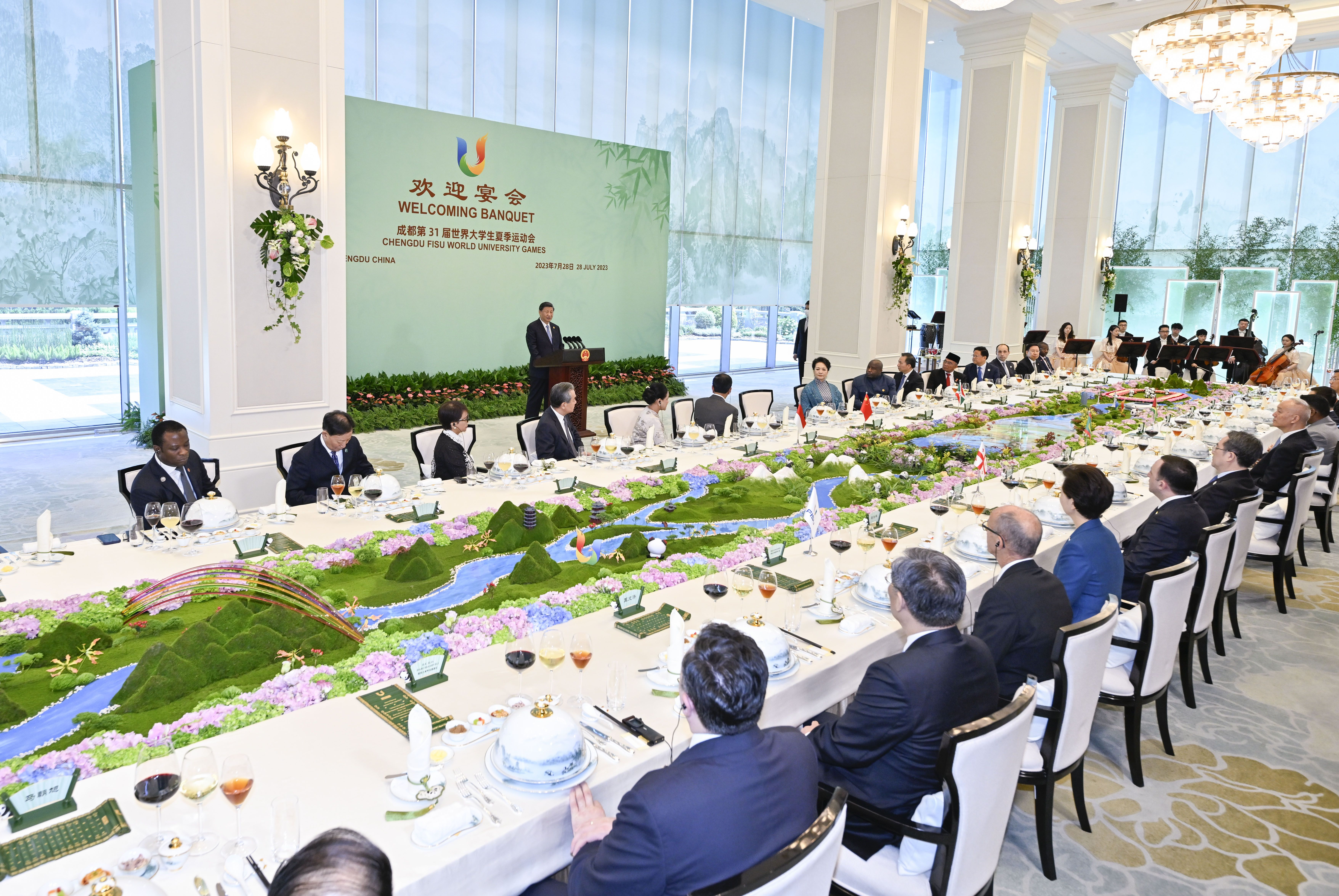 △2023年7月28日,国家主席习近平和夫人彭丽媛在四川省成都市金牛宾馆举行宴会,欢迎出席成都第31届世界大学生夏季运动会开幕式的国际贵宾。
