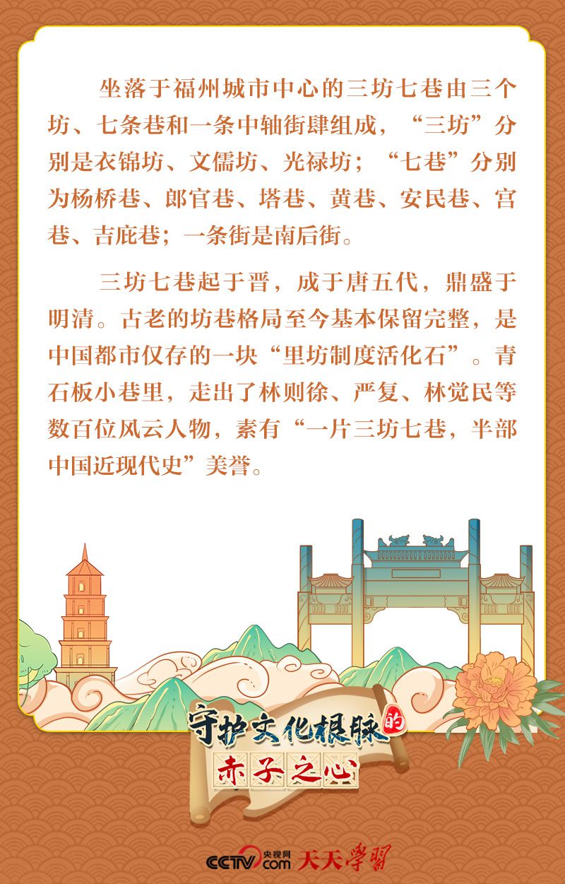 天天学习空中俯瞰三坊七巷,飞檐翘角、古厝连绵,屋顶如波浪般延伸铺展,十分壮观。