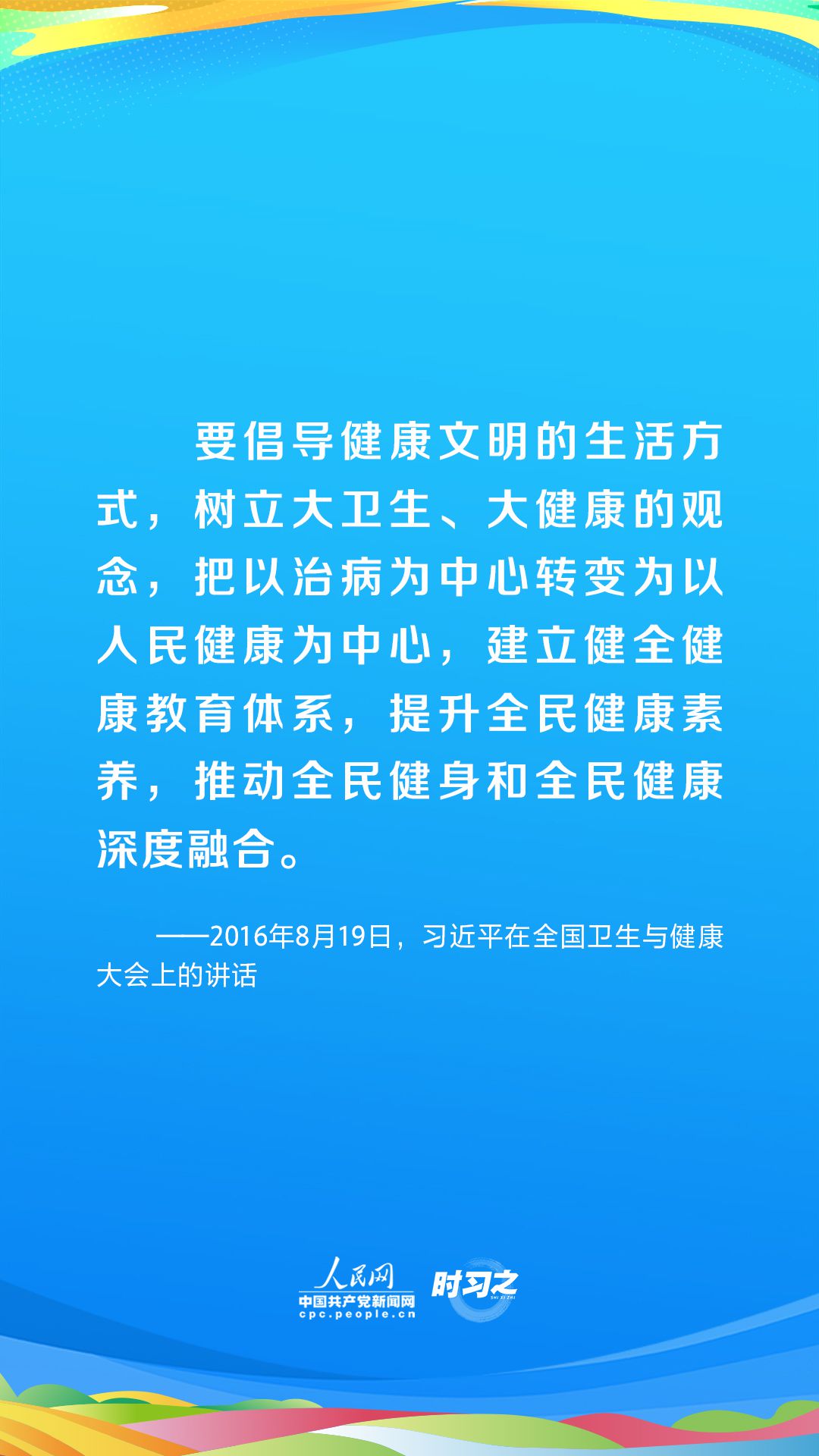 2023年8月8日是全民健身日。全民健身,关乎人民幸福,关乎民族未来。习近平总书记始终坚持以人民健康为中心,把人民身体健康作为全面建成小康社会的重要内涵,推动全民健身与全民健康深度融合,为全面小康筑牢健康之基。