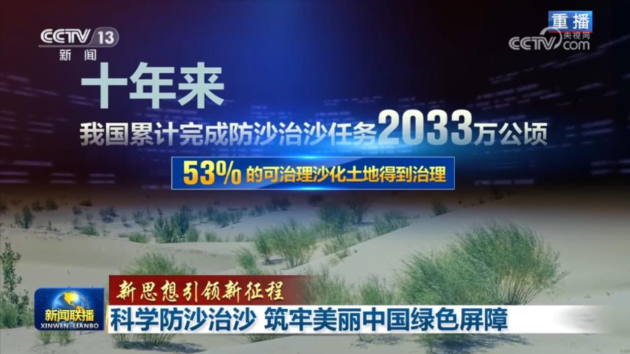 十年来,我国累计完成防沙治沙任务2033万公顷,53%的可治理沙化土地得到治理,荒漠化、沙化土地面积分别比十年前净减少500万公顷、433万公顷,沙区植被平均覆盖度上升了2.6个百分点。八大沙漠、四大沙地的土壤风蚀总量较2000年下降约40%。