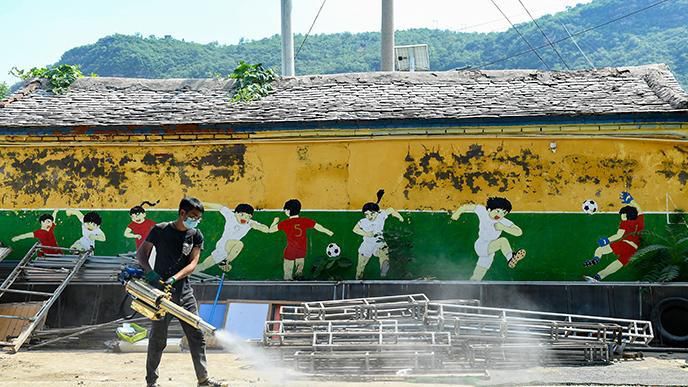 8月15日,北京市房山区河北镇中心幼儿园东庄子分园教师李笑博在园内消杀。新华社图