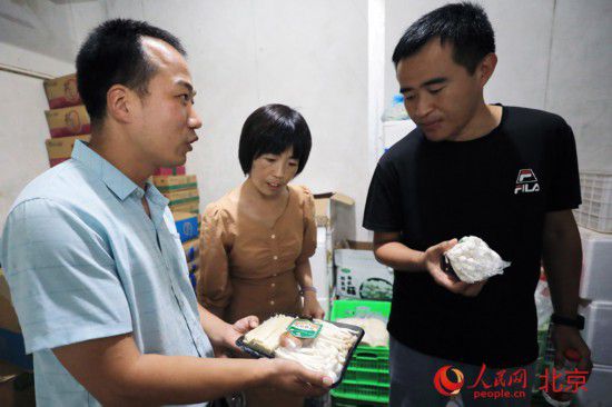 郭洋(左一)给客户介绍菌类产品。 人民网记者 尹星云摄