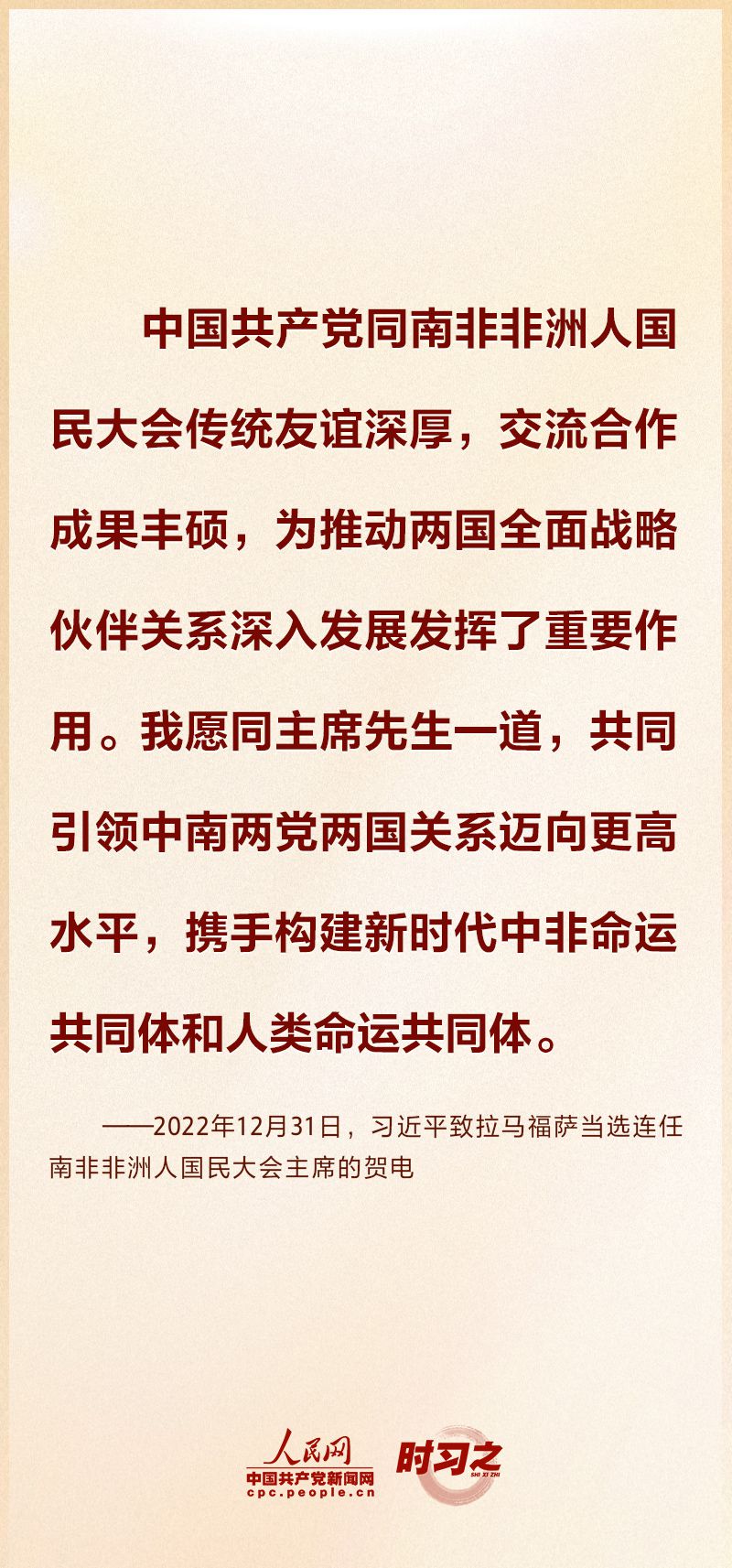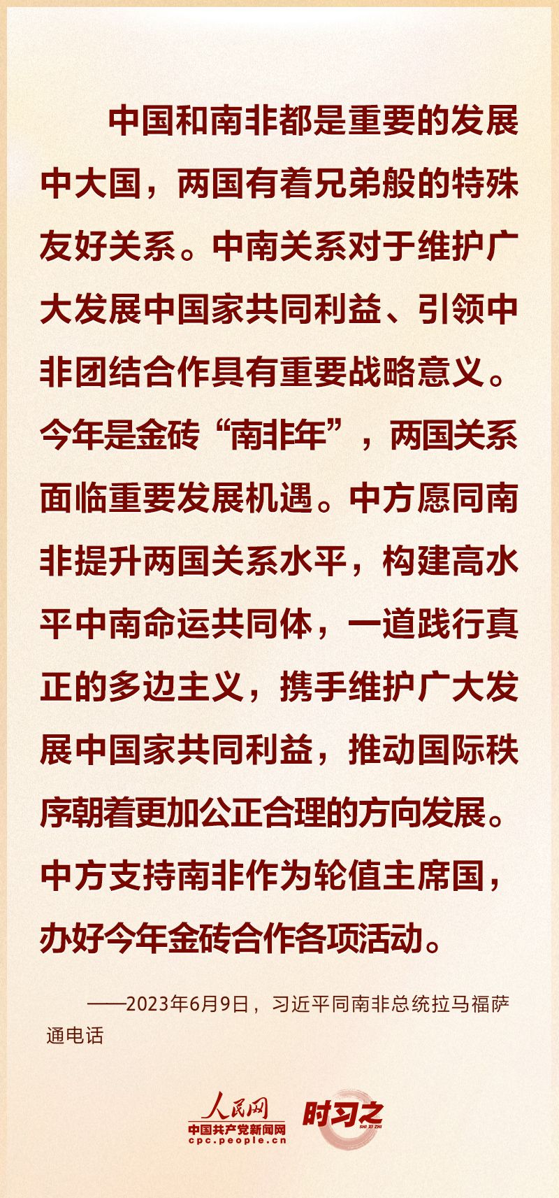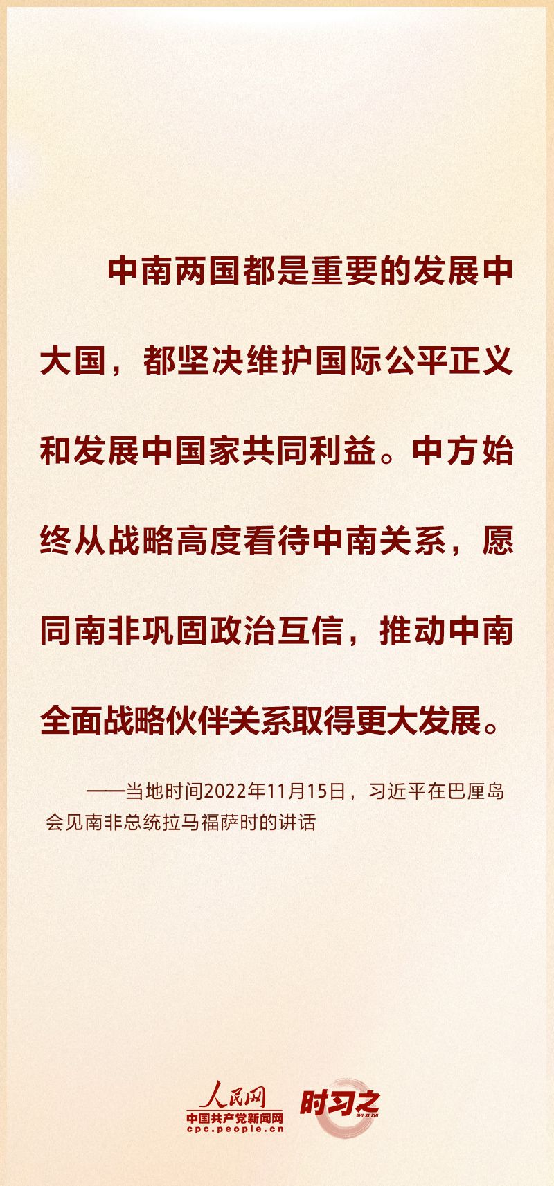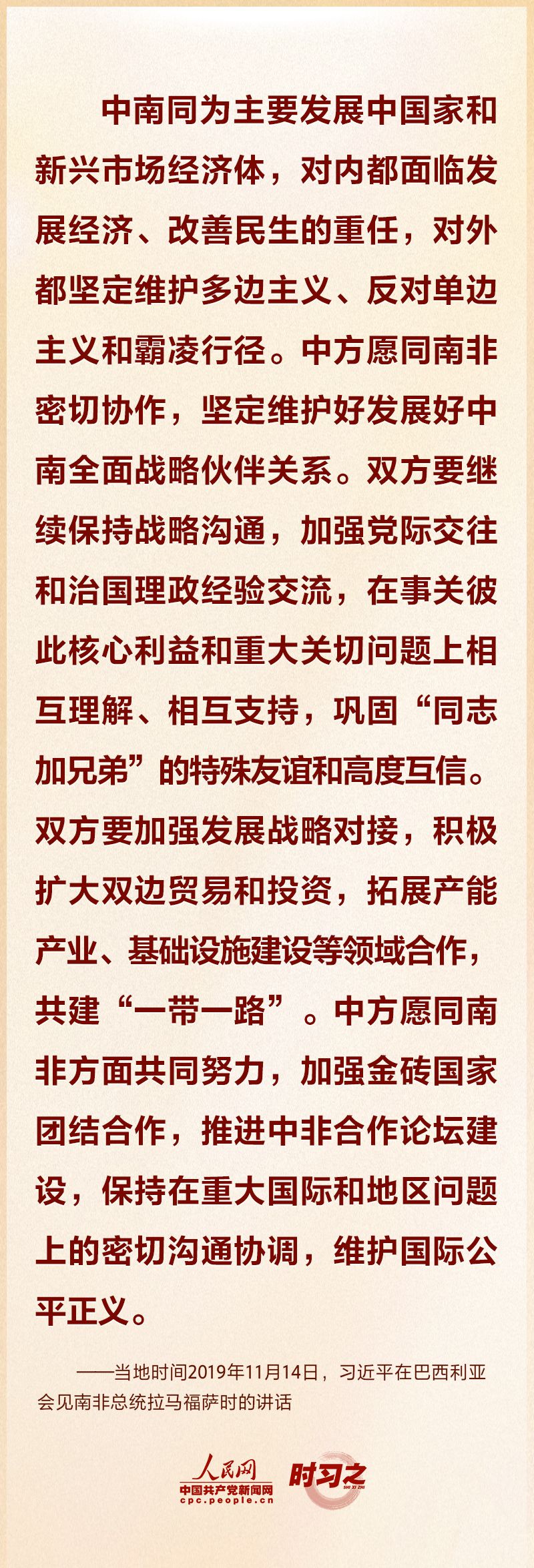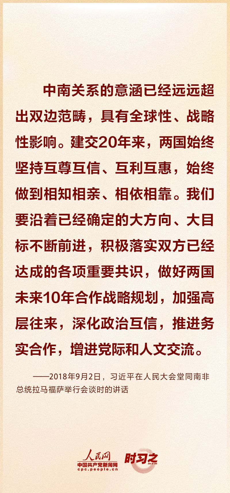 今年是中南建交25周年,也是金砖“南非年”。中国和南非都是重要的发展中大国,两国有着兄弟般的特殊友好关系。习近平主席曾在多个场合阐释中南关系、中南友谊、中南合作,积极推动构建高水平中南命运共同体。