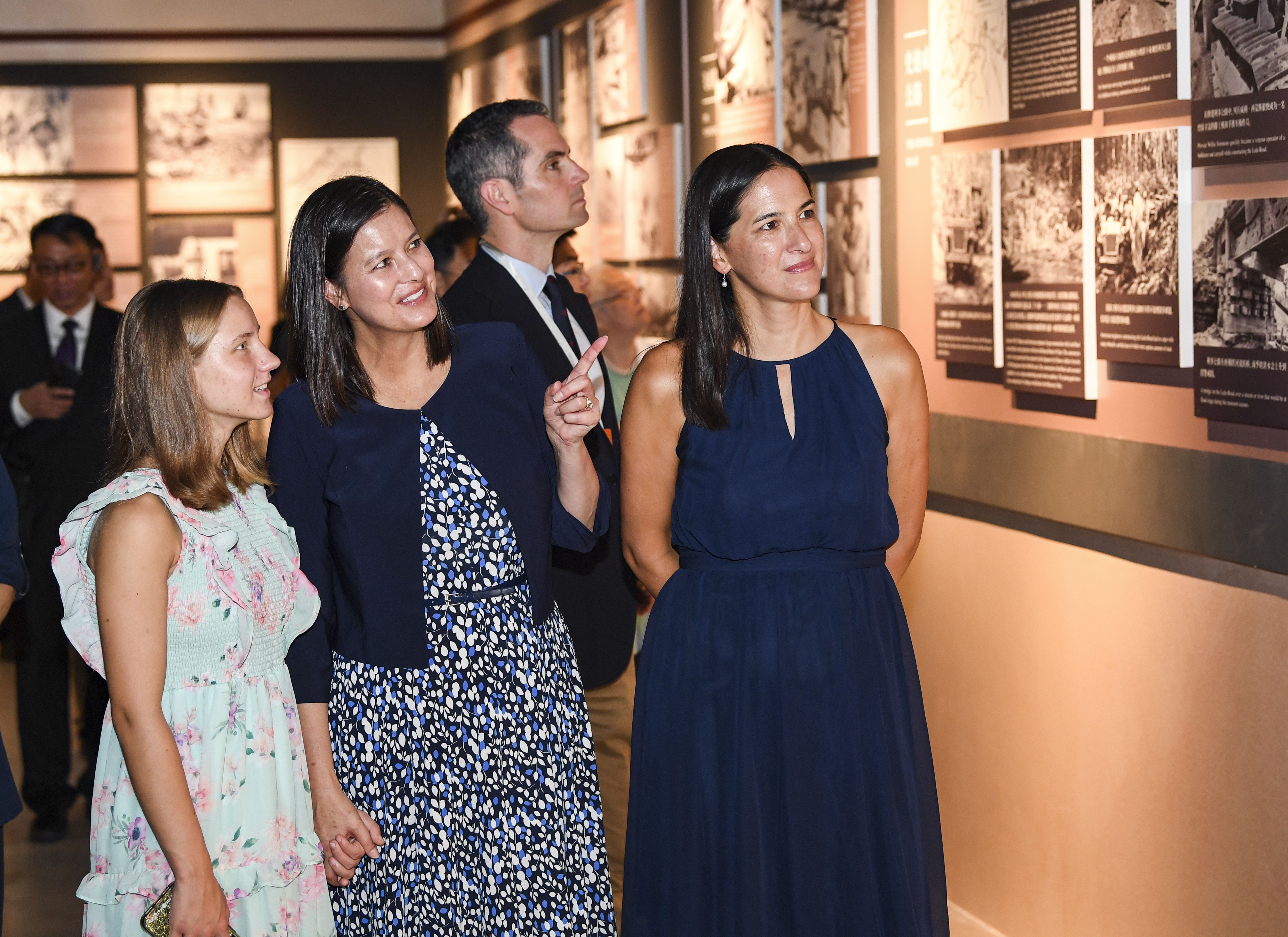2023年8月8日,史迪威将军曾外孙女苏珊·科尔(左二)、南希·米尔沃德(右一)在史迪威将军生平图片展上参观。