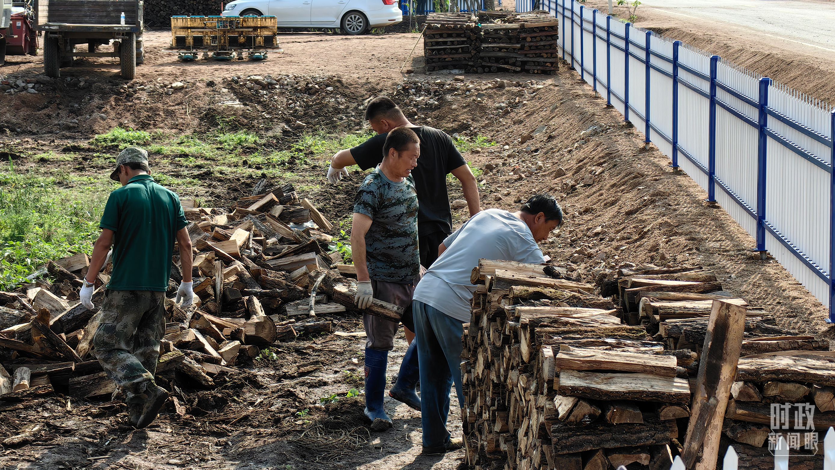 △村民正在整理家中被洪水冲垮的柴火垛。(总台央广记者潘毅拍摄)