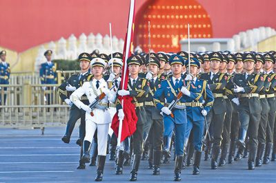 10月1日早晨6时许,伴随着清晨的第一缕阳光,30多万各界群众在北京天安门广场共同见证五星红旗冉冉升起的庄严时刻。“向国旗——敬礼!”随着仪仗队员的口号声,《义勇军进行曲》响彻天安门广场。升旗仪式结束后,伴随着《歌唱祖国》的奏乐,人们挥舞着手中的国旗,尽情唱响爱国赞歌,“祝福祖国”“祖国万岁”的欢呼声在广场上空久久回荡。“作为大学生,我将努力成长为担当民族复兴重任的栋梁之材!”北京大学软件与微电子学院学生张琦暄观看完升旗仪式后难掩激动之情。