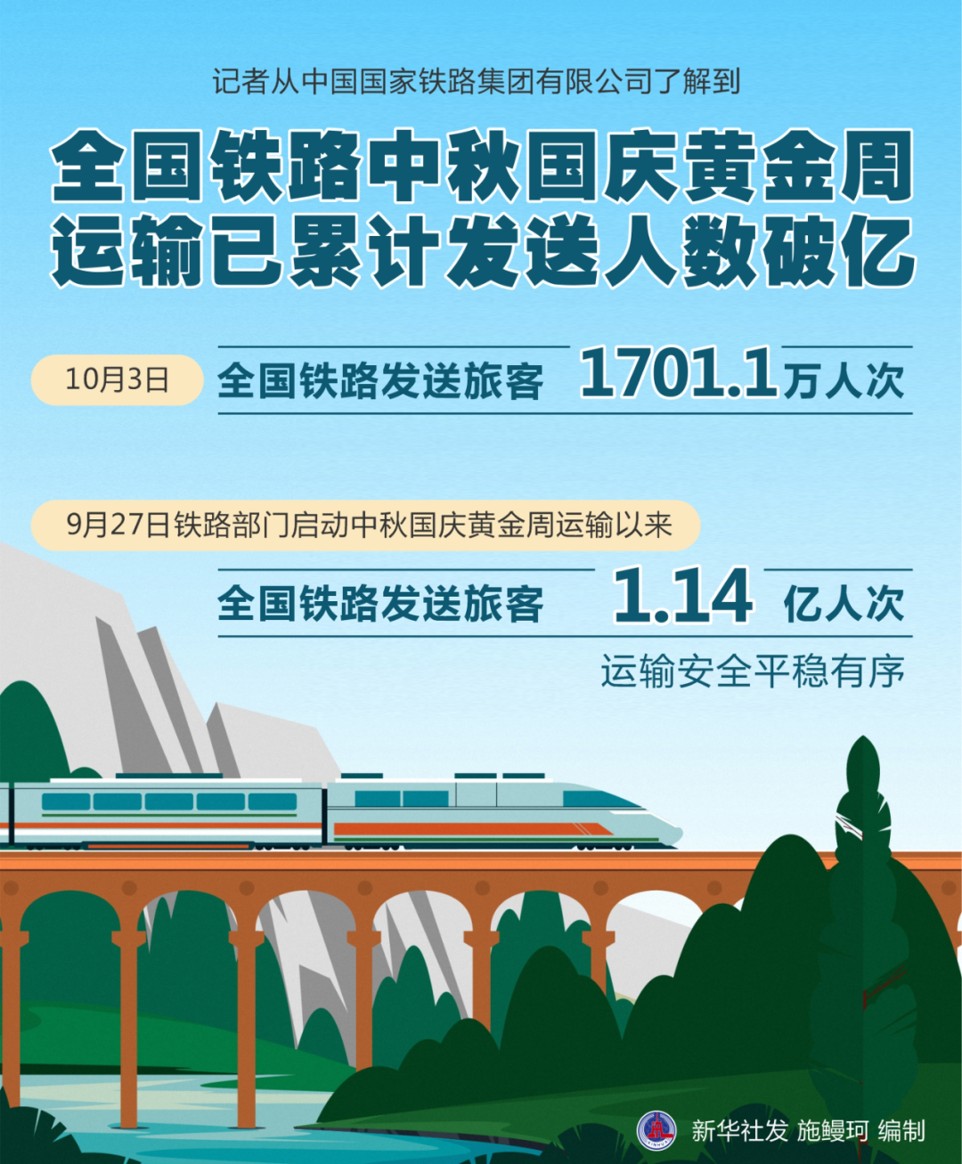 6、全国铁路中秋国庆黄金周运输已累计发送人数破亿。